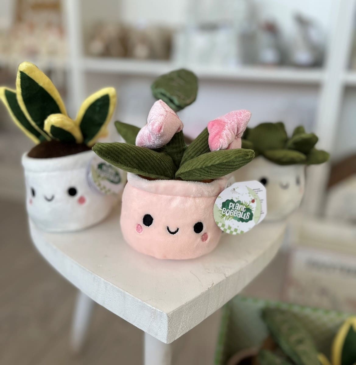 White Boball with all green leaves White Boball with 2 shades of green leaves Pink Boball with pink flowers Pink Boball with pink and green leaf
