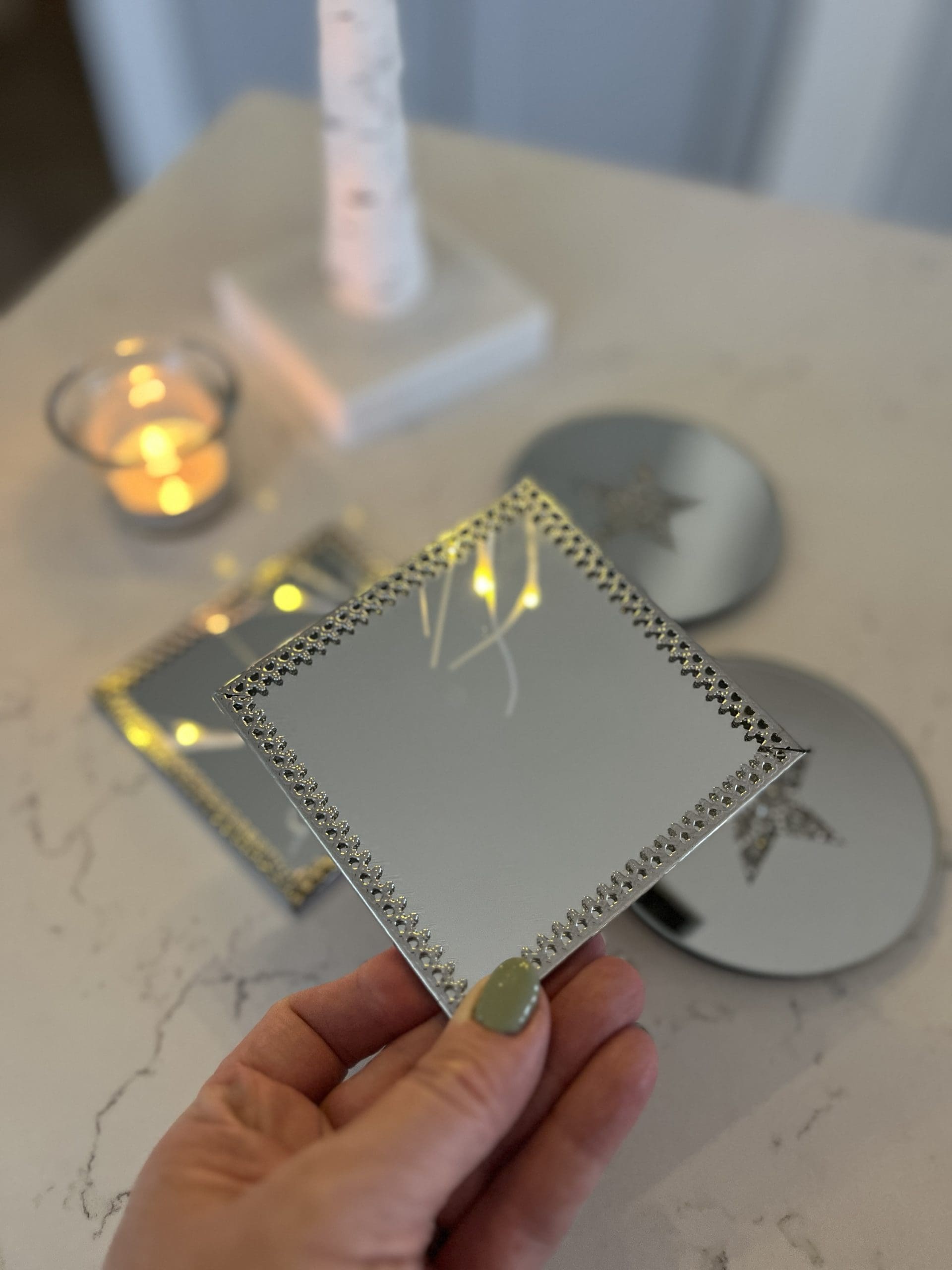 Glass Candle Plate With a Silver Coloured Metal Trim Comes In 2 Assorted Designs Priced Individually