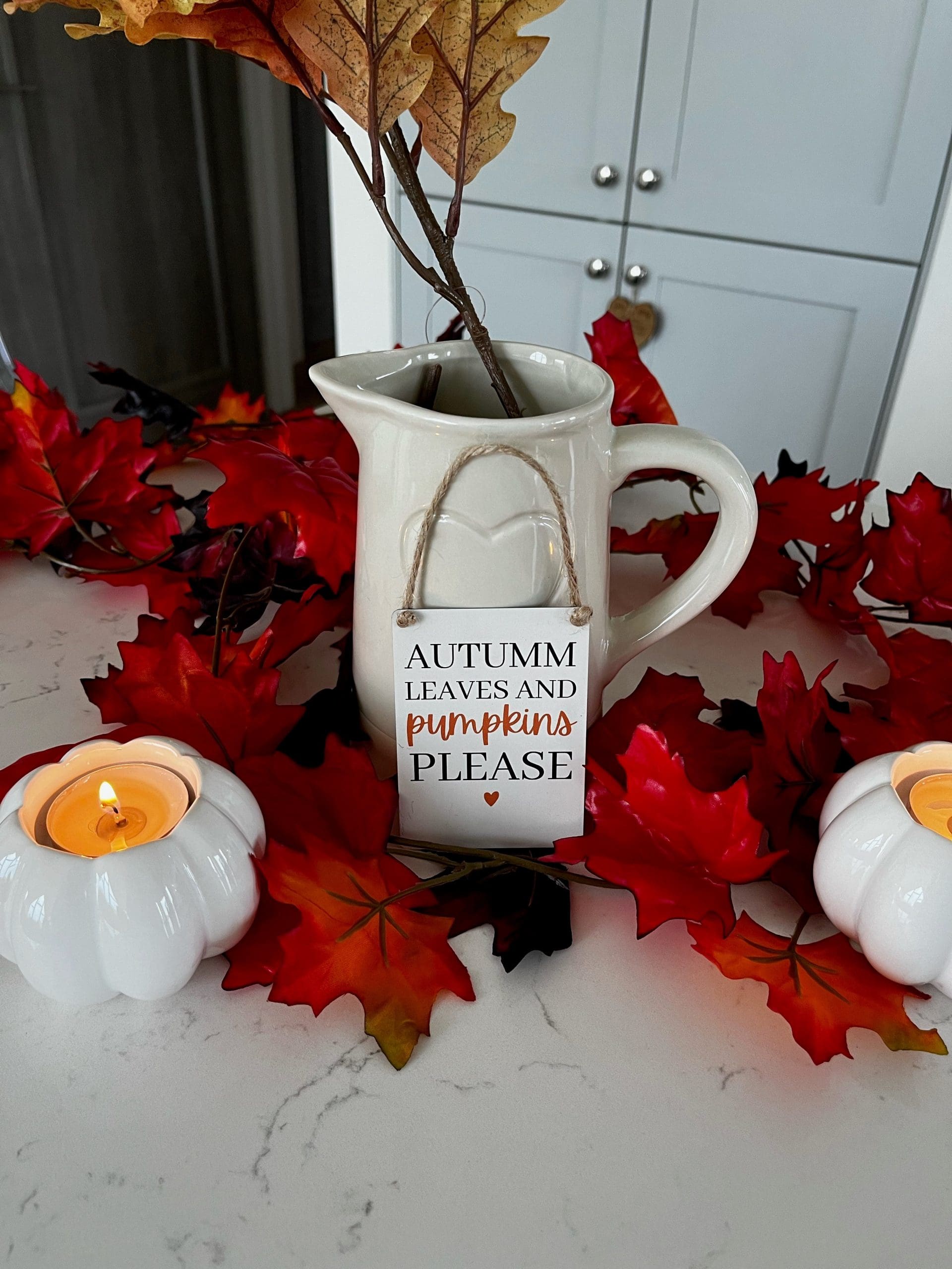 Autumn leaves and pumpkins please. A charming mini metal sign with a jute string hanger.