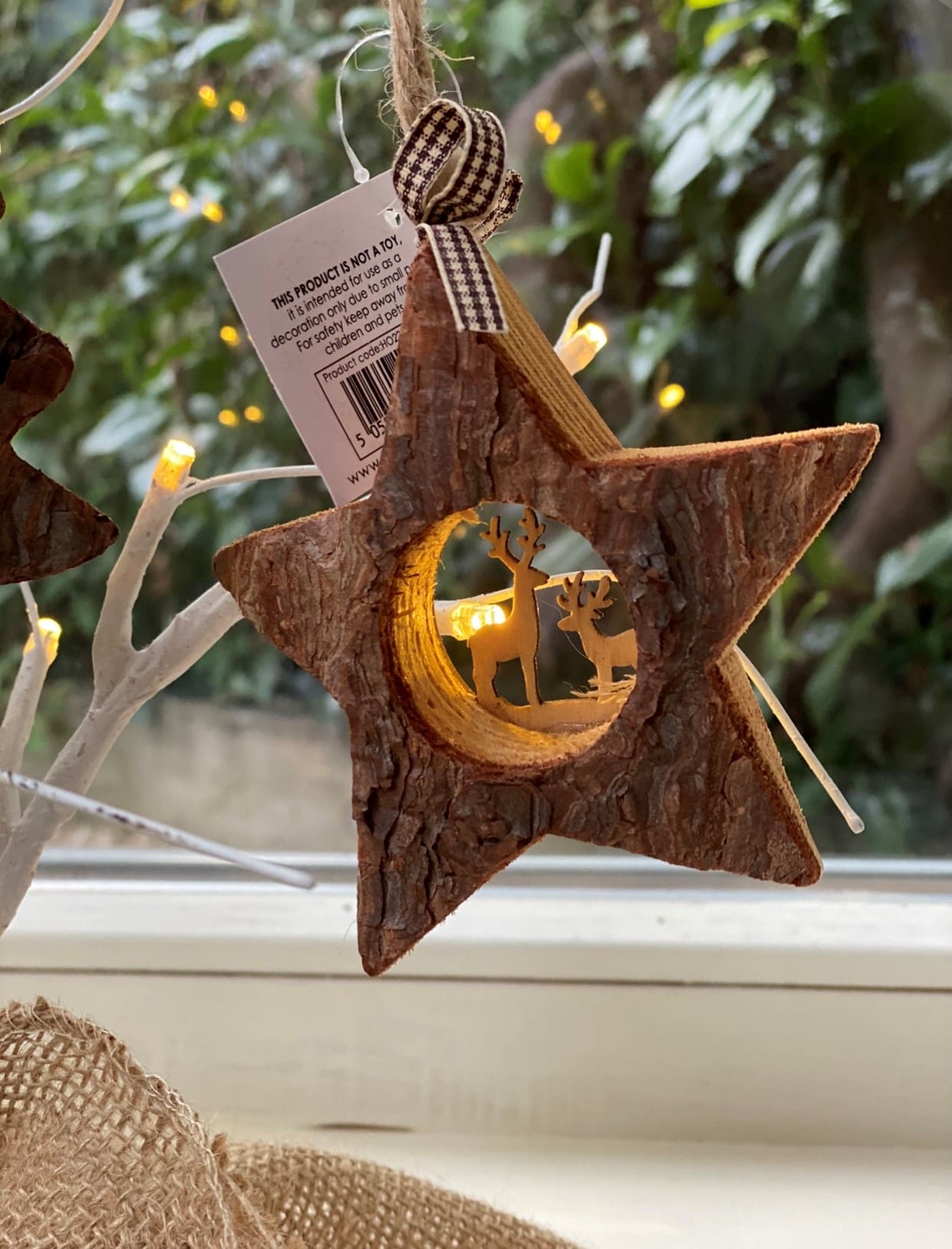 Bark Tree Star Decoration Mix Two stunning wooden decorations with laser cut design detail and ribbon. Size 10 x 9 x 1.5cm