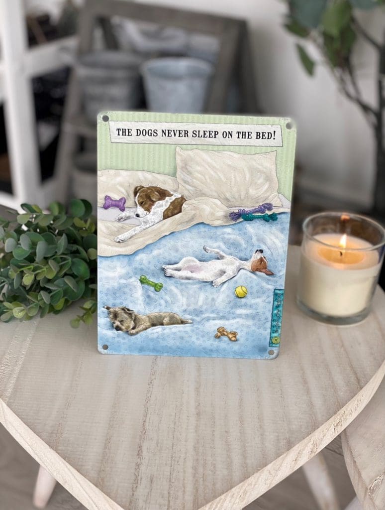 THE DOG NEVER SLEEPS ON THE BED SIGN