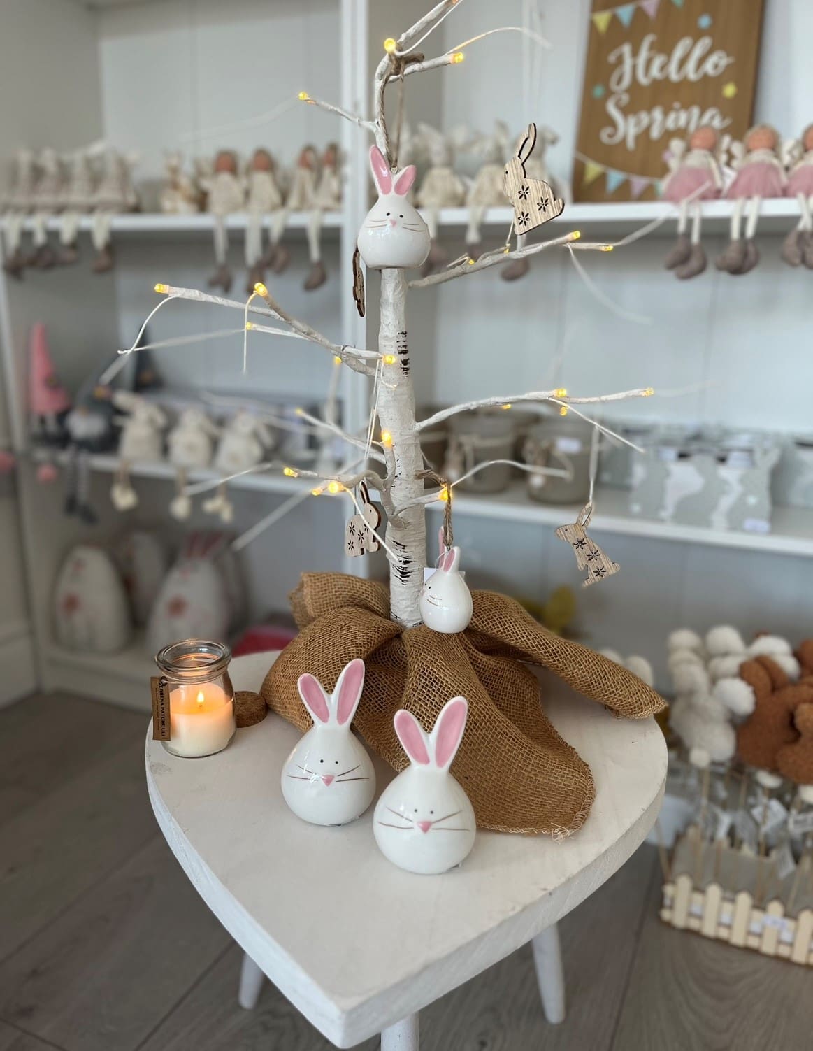 A charming bunny shaped decoration with pink pastel details and a rustic jute string hanger.