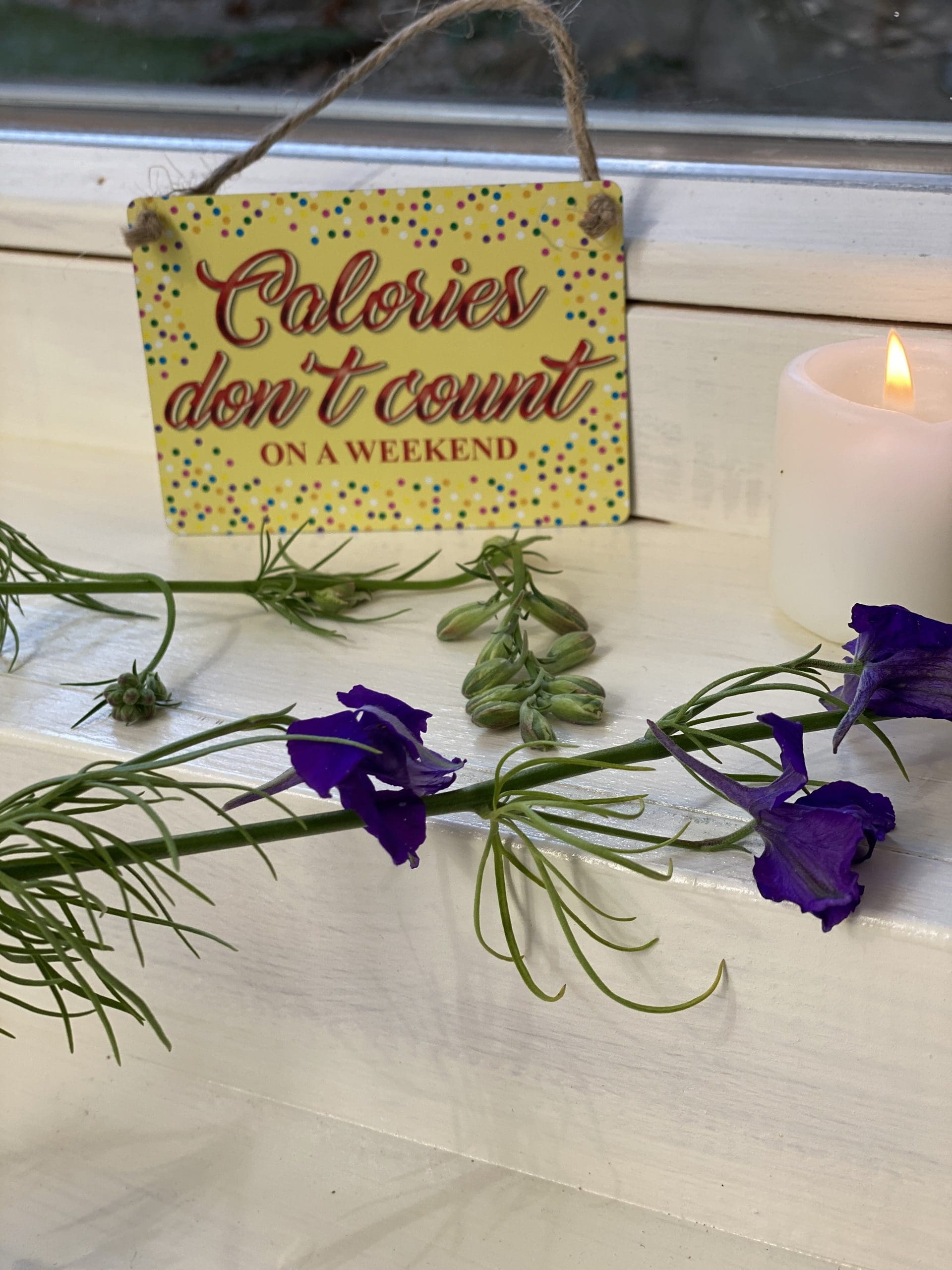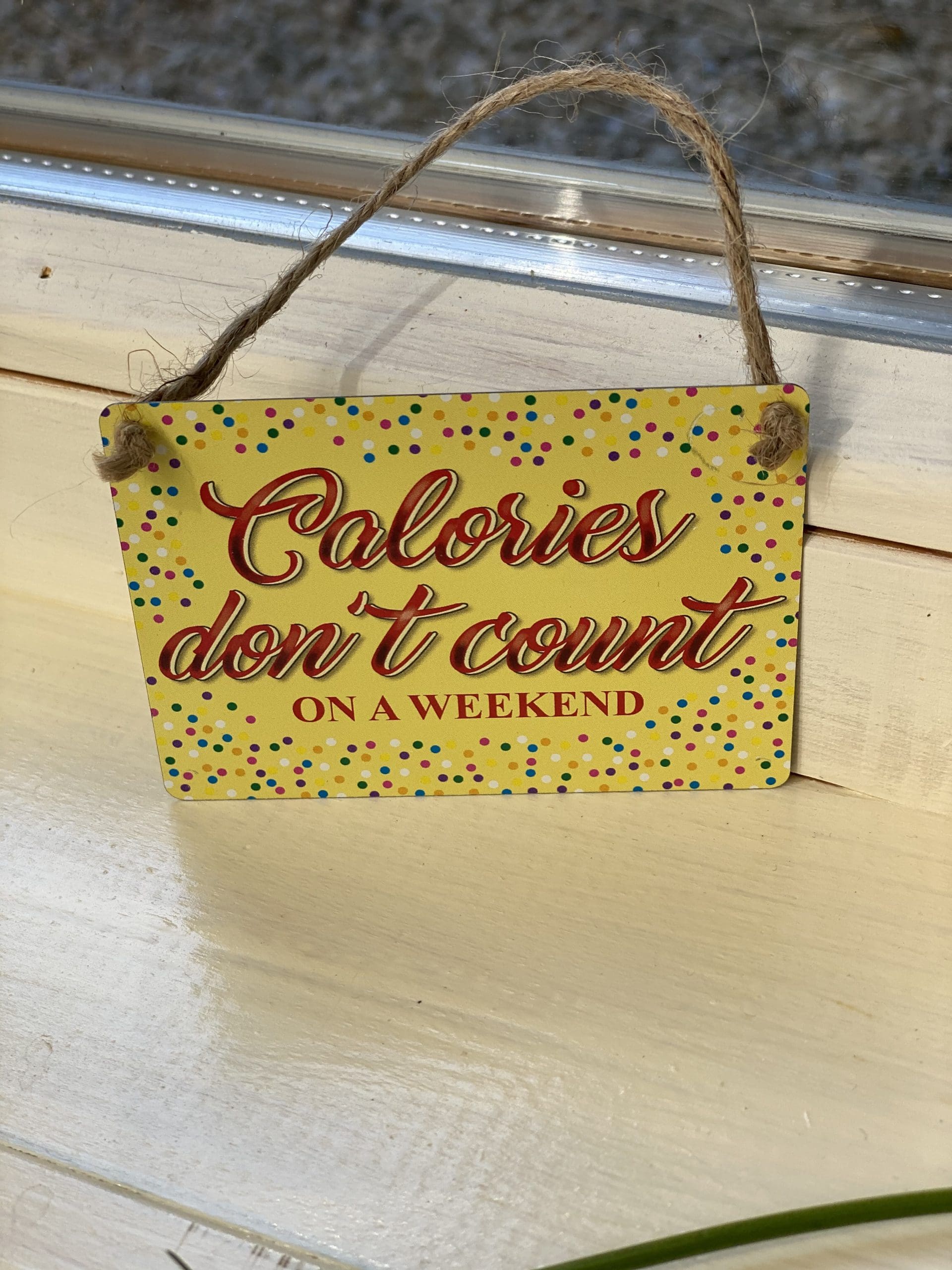 Calories Don’t Count Mini Metal Sign- Calories Who ? Never heard of them…. This comical script mini metal sign will look perfect in any kitchen where calories arent counted! Size: 9.5cm x 6cm