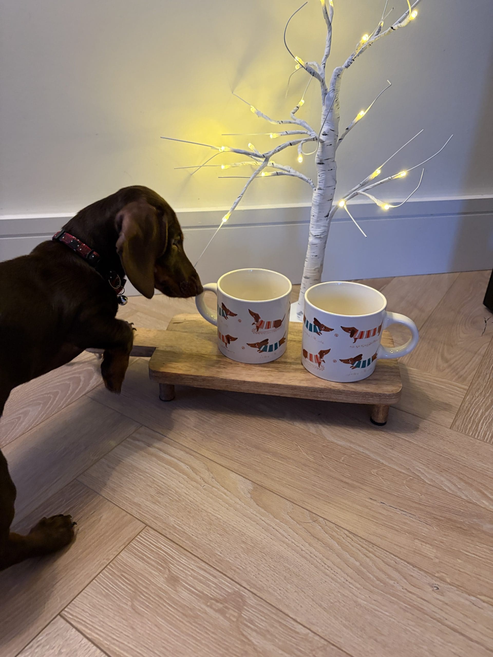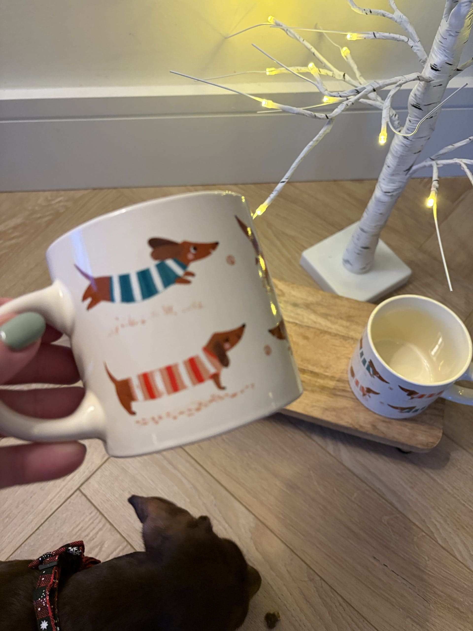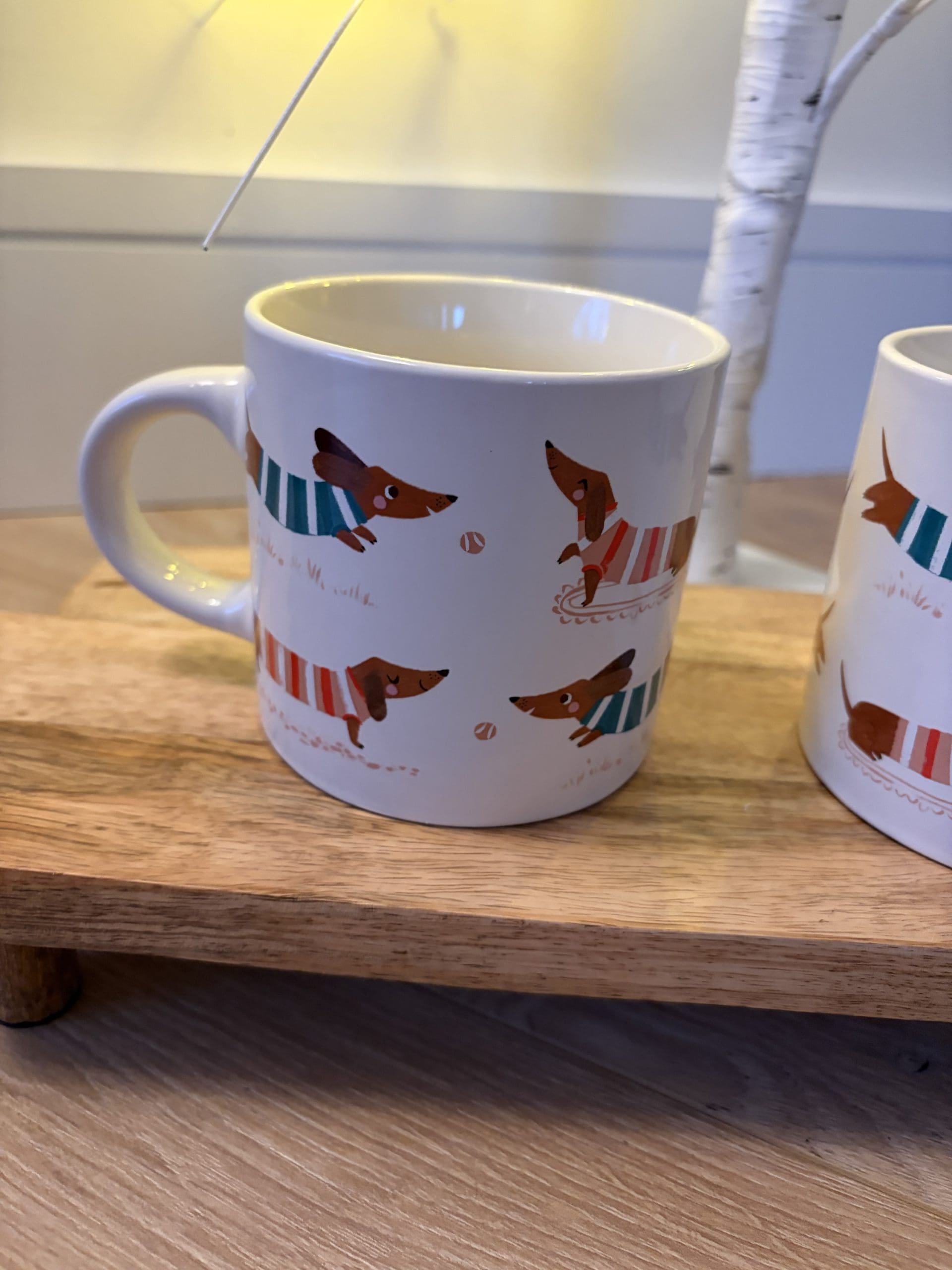 Enjoy your morning brew in style with this cute mug adorned with sweet sausage dogs wearing stripy jumpers. Dishwasher safe. Size: 13cm x 8.9cm x 8.5cm