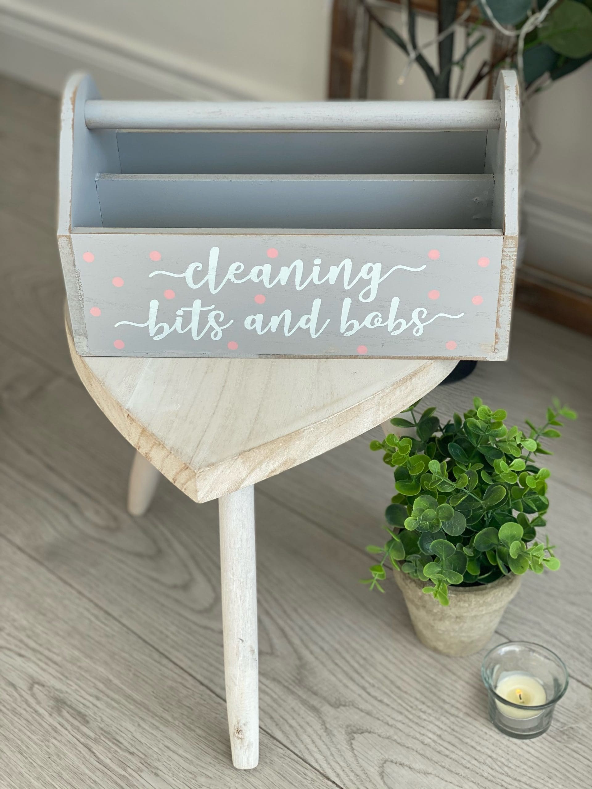 Gorgeous shabby chic cleaning crate, grey in colour with pink dots and white text on the front.