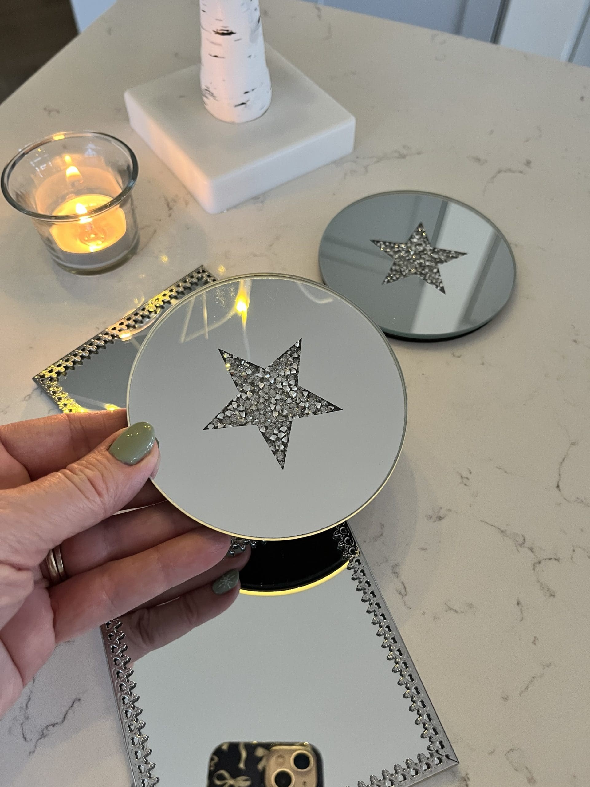 A luxury themed mirrored candle plate set with a glitzy starred central display