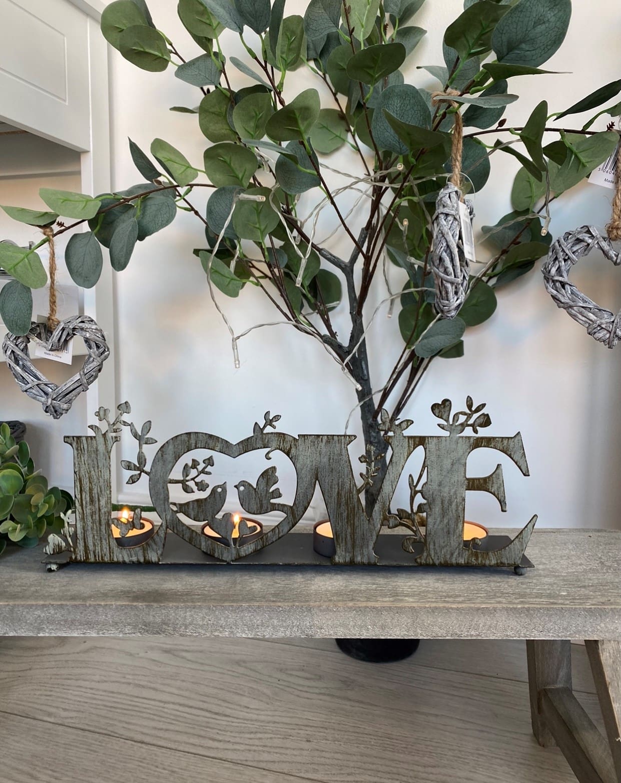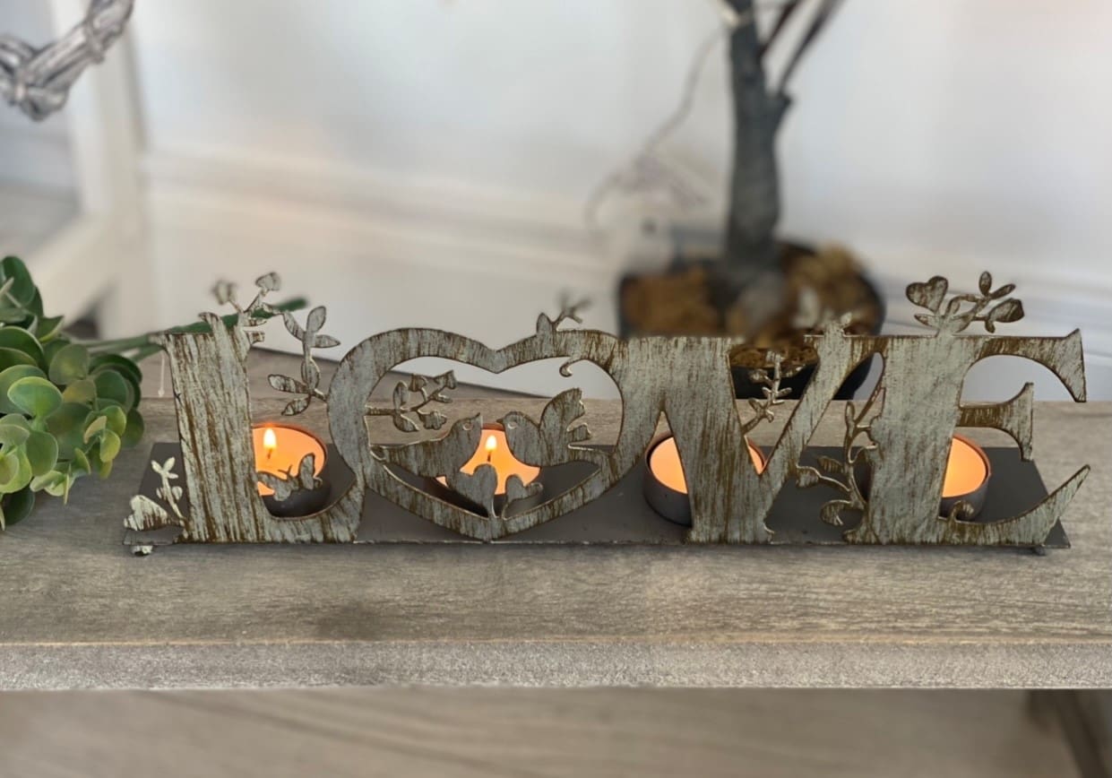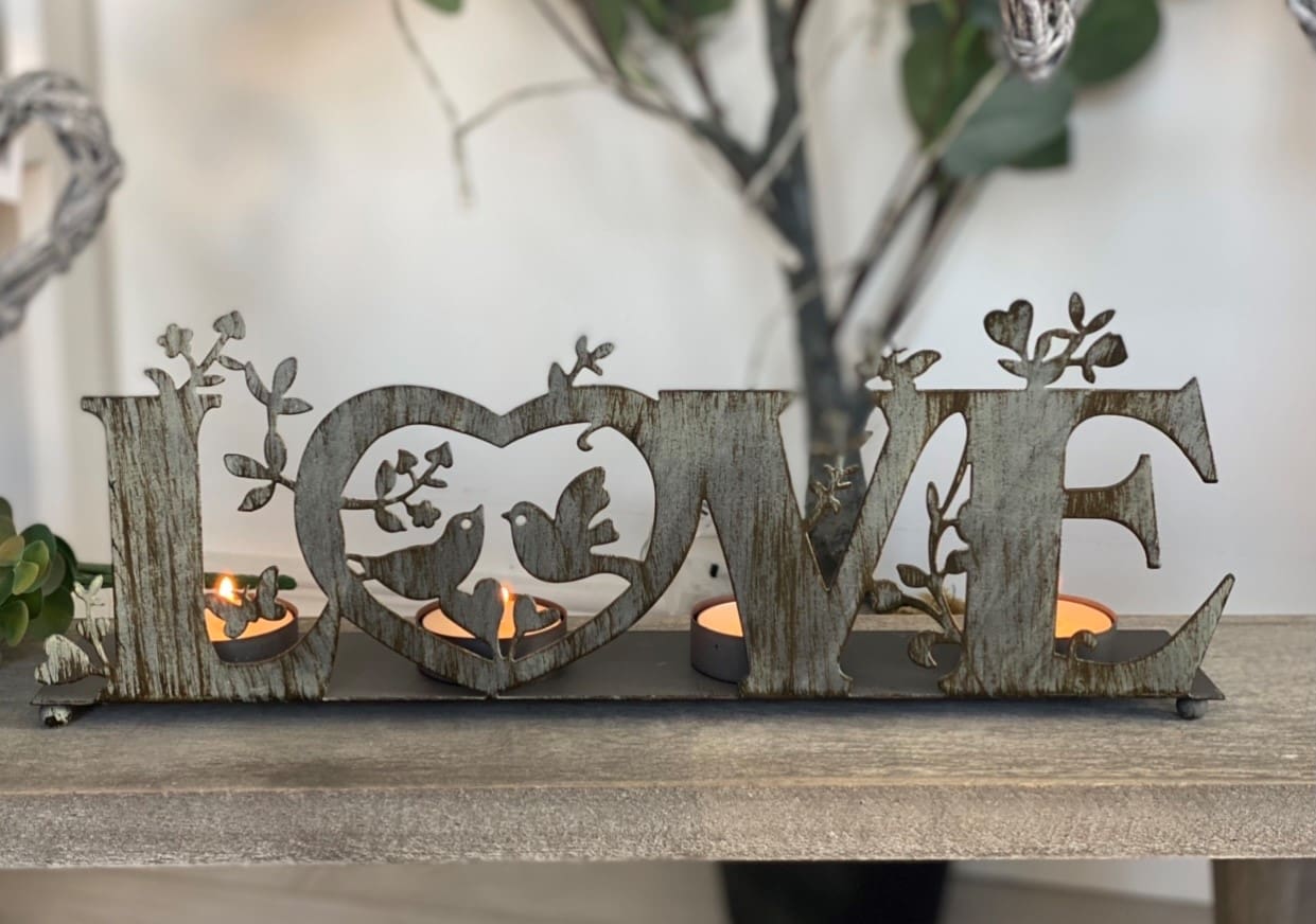 A beautifully rustic themed iron candle holder with an added LOVE text decal Size approximately 31.5cm x 11cm