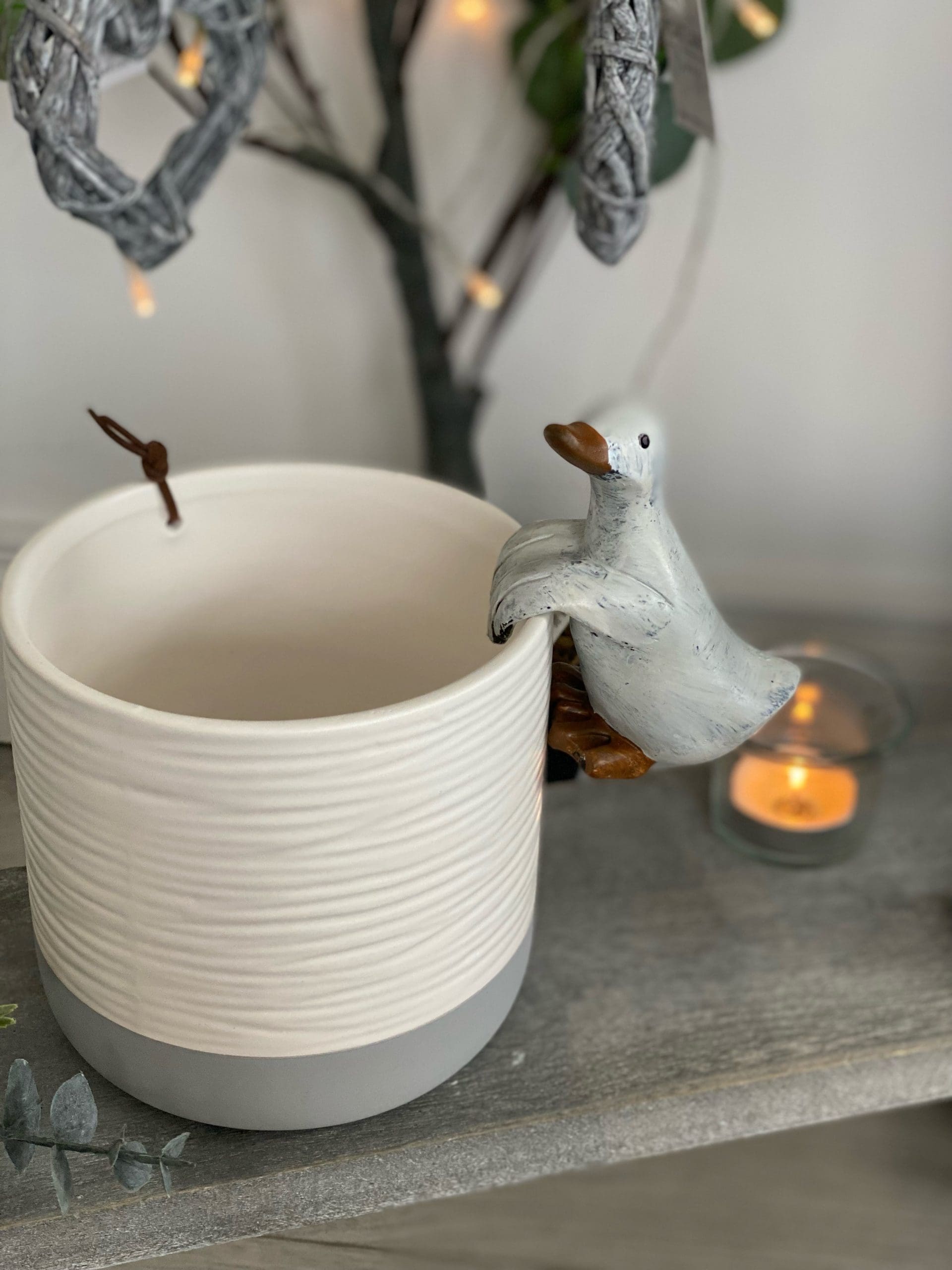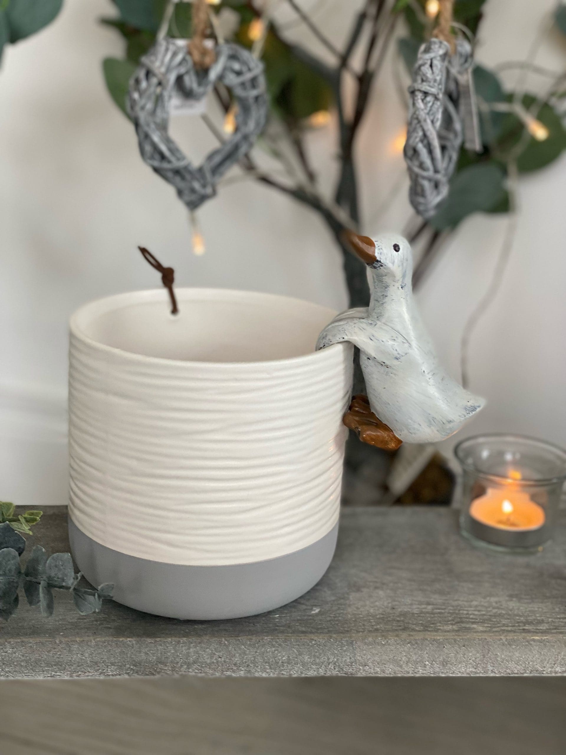 An adorable pot hanging duck figure with a rustic feature and cute charm