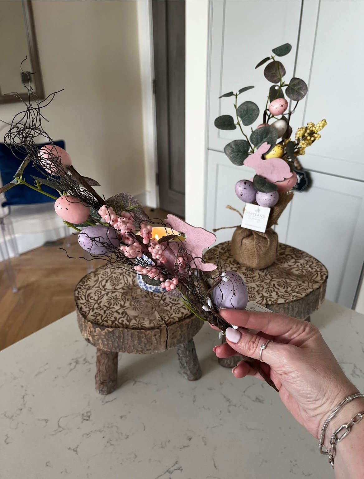 A beautifully detailed artificial floral sprig with pastel coloured speckled eggs and a wooden bunny detail. Size 48cm