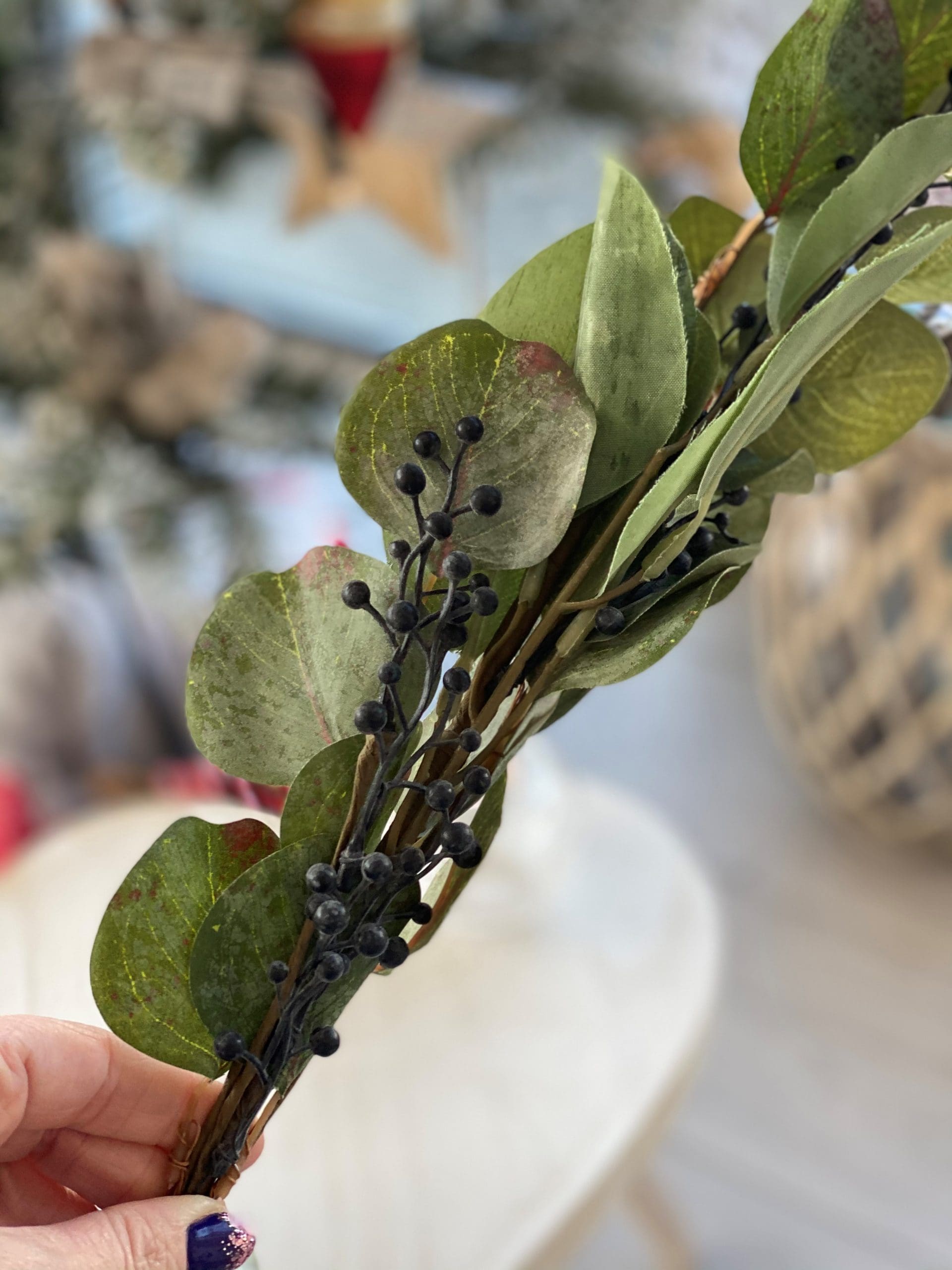 A gorgeously tall standing artificial Eucalyptus Spray with added berries