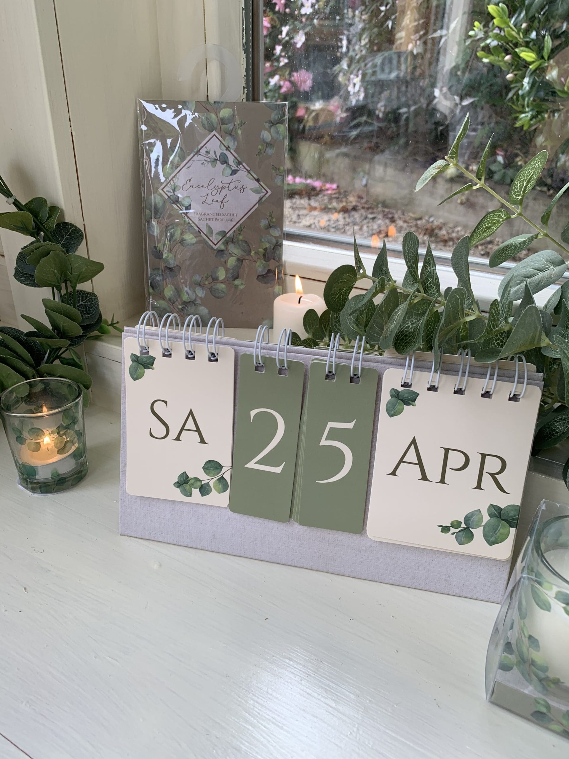 Eucalyptus Flip Calendar, keep track of your busy days with the help of this stylishly chic flip calendar. With its Eucalyptus prints & added sage green tones, this beautiful accessory will place perfectly on any desk, side table or counter in the home. Measures approx: 22 x 6 x 12cm high