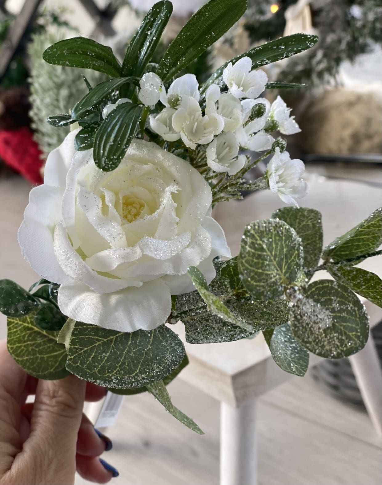 Faux Silk White Rose & Mistletoe Frosted Bunch 30cm/12 Inches