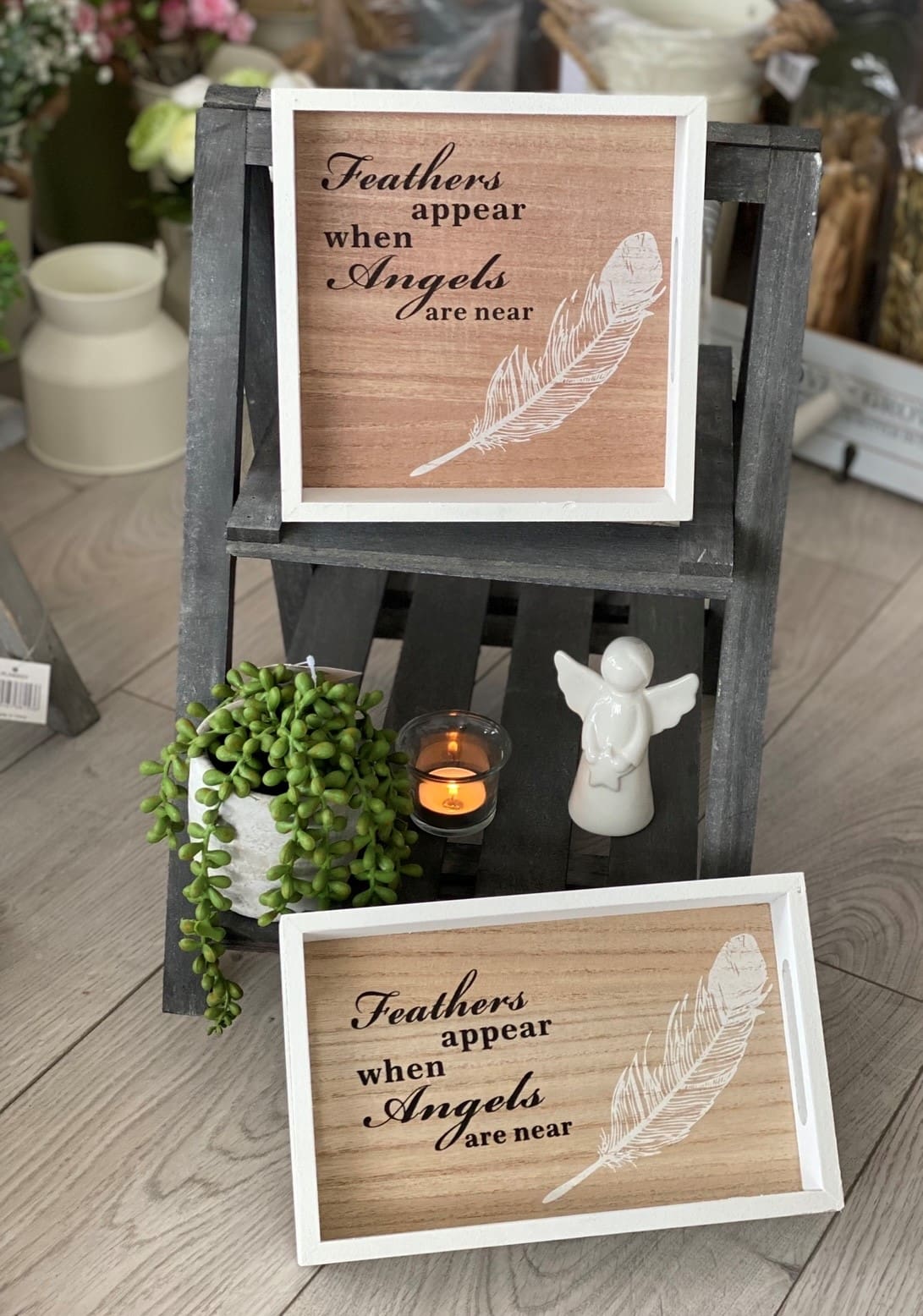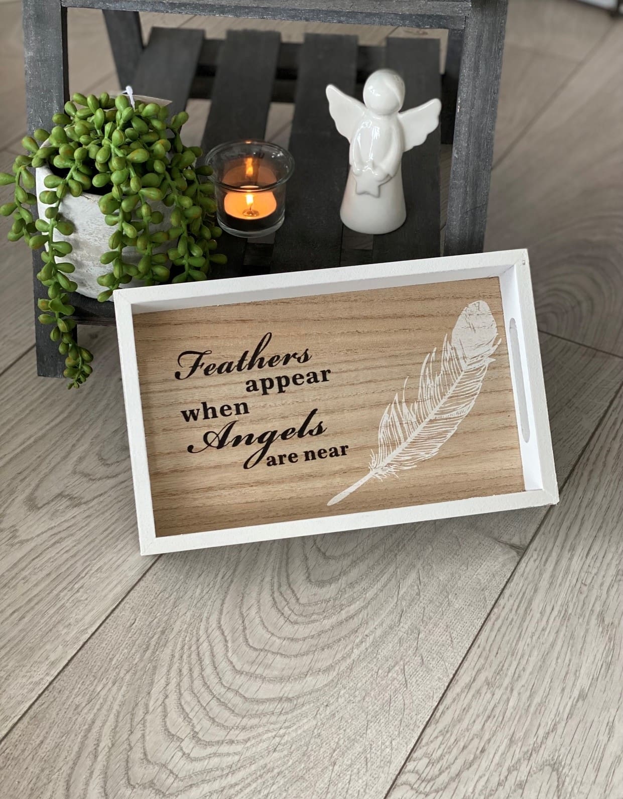 With its Shabby Chic inspired edge and scripted “Feathers appear when angels are near” text, this wooden tray will make a wonderful decoration in any home