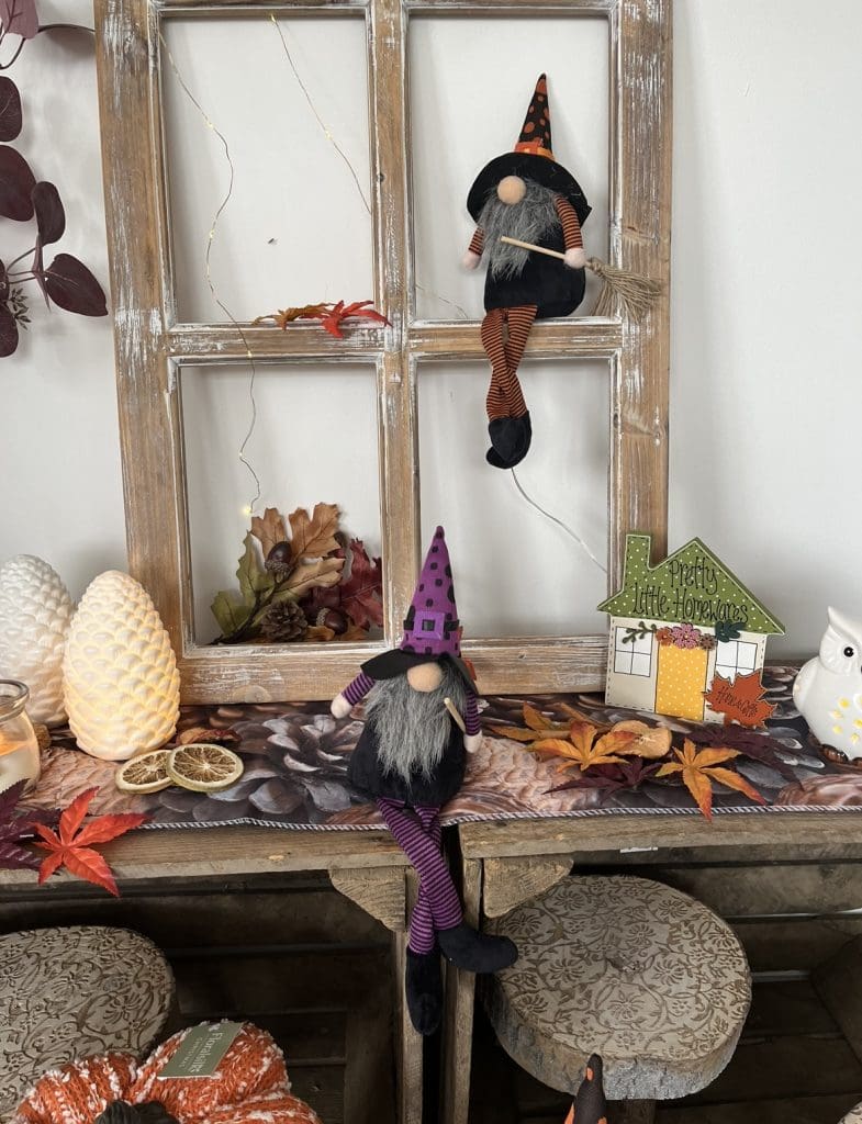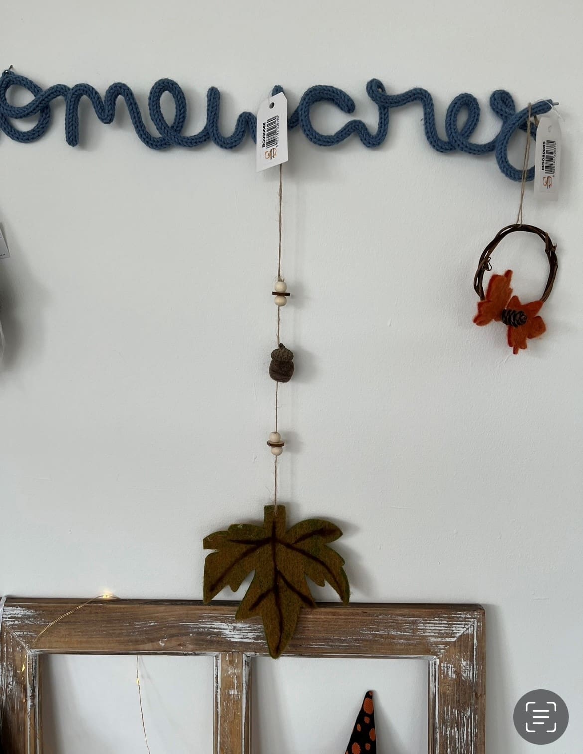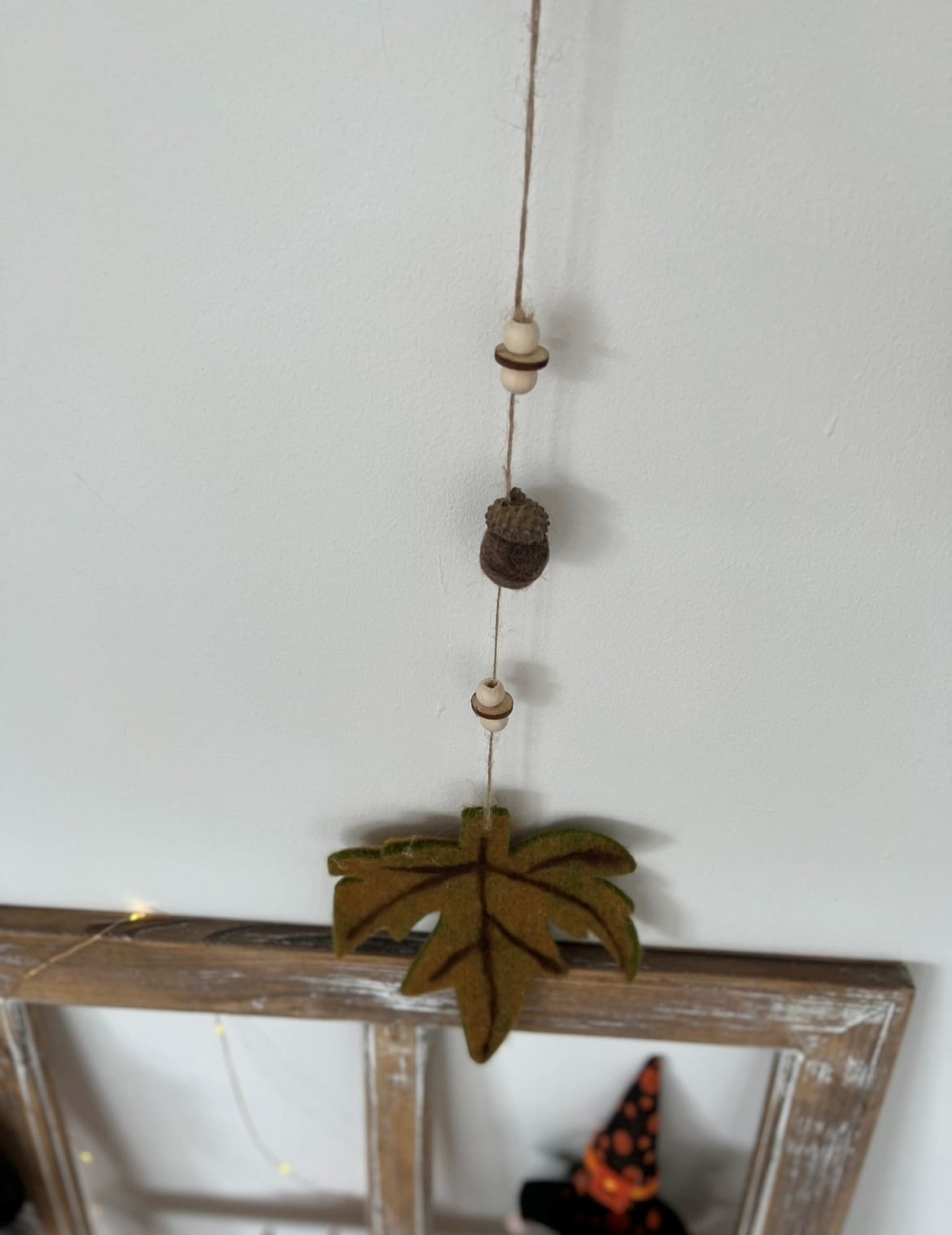 Wool leaf in autumnal colours on jute string with acorns and beads.