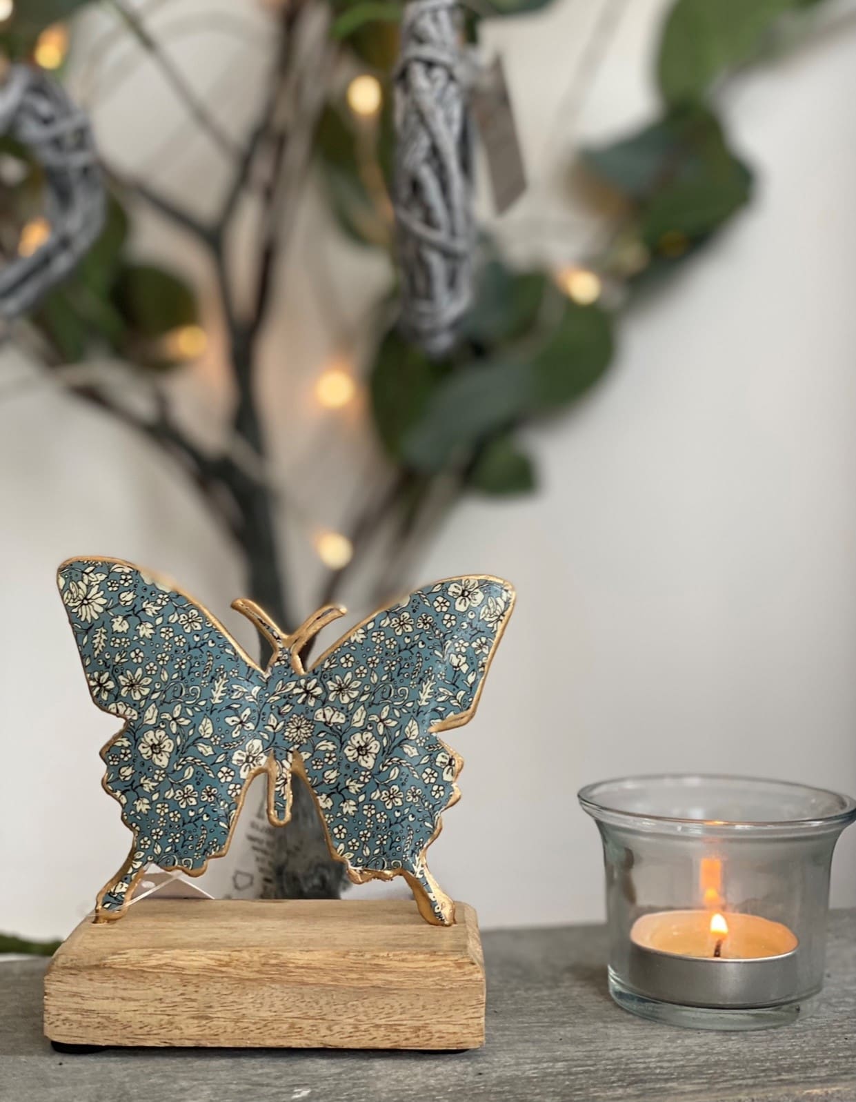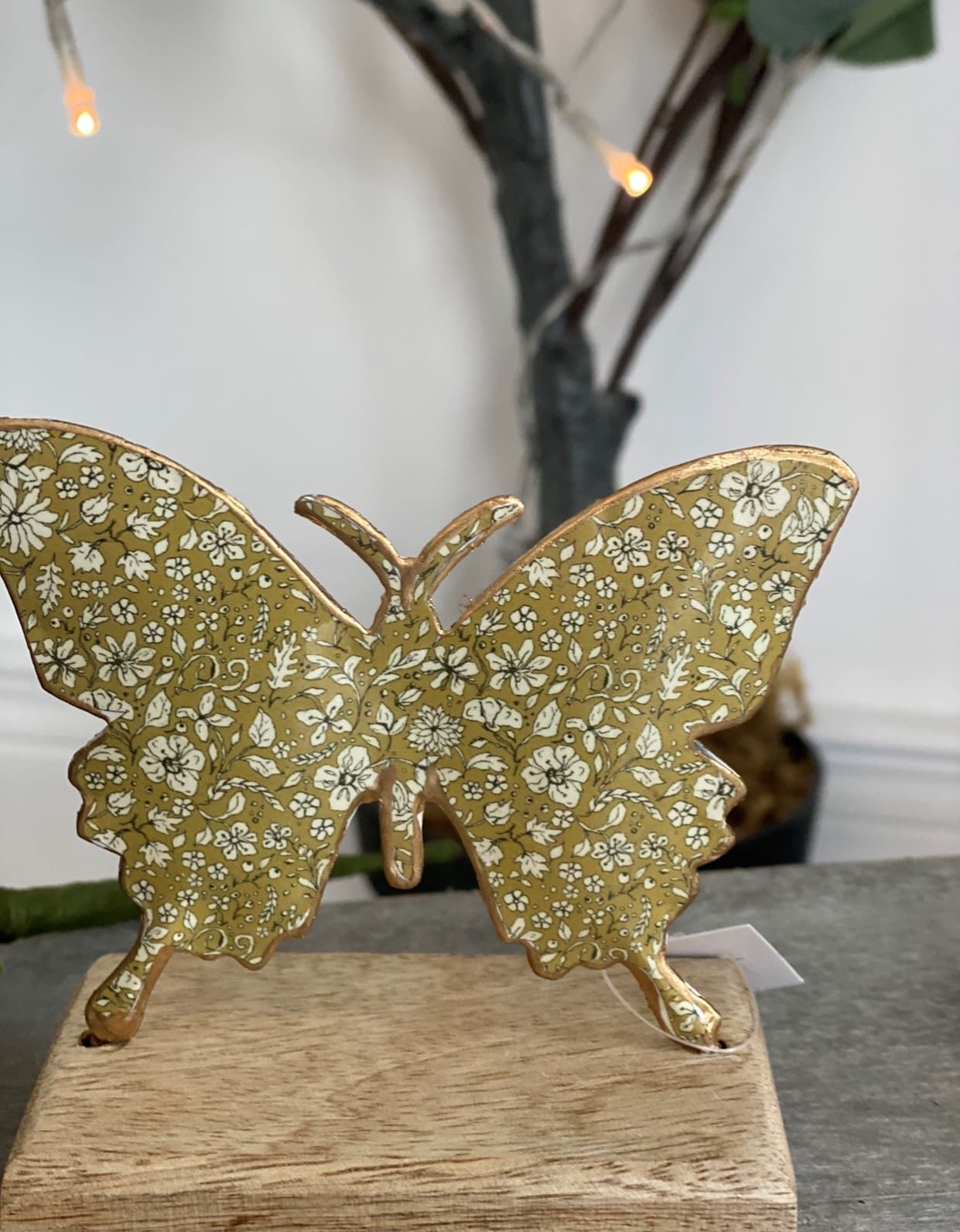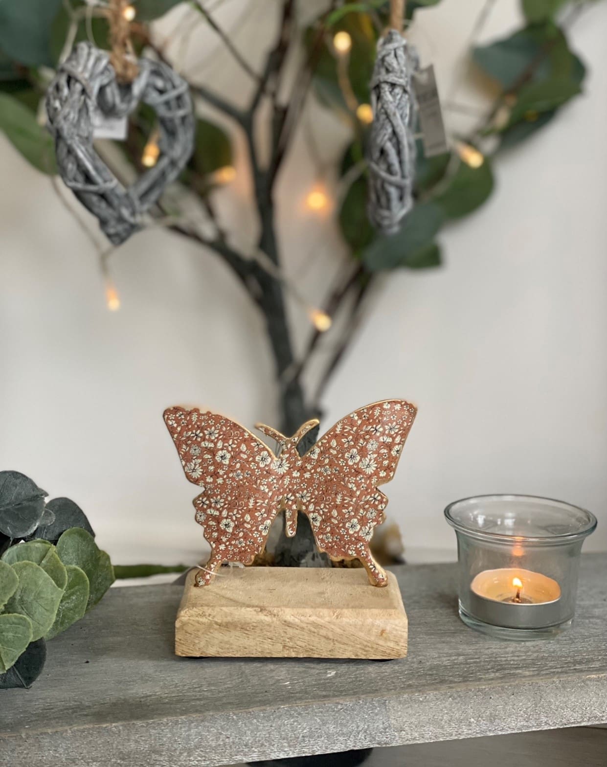 Sure to bring a floral feel to any space of the home, a wooden block based ornament with a butterfly decal.