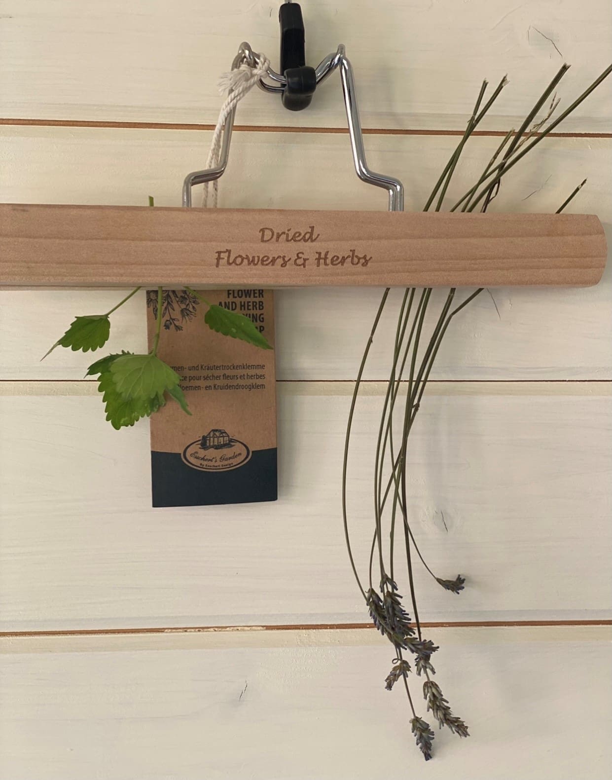 Hanging By a Metal Hanger a Drying Rack Perfect For Flowers And Herbs. With ‘Dried Flowers And Herbs’ Text On The Front