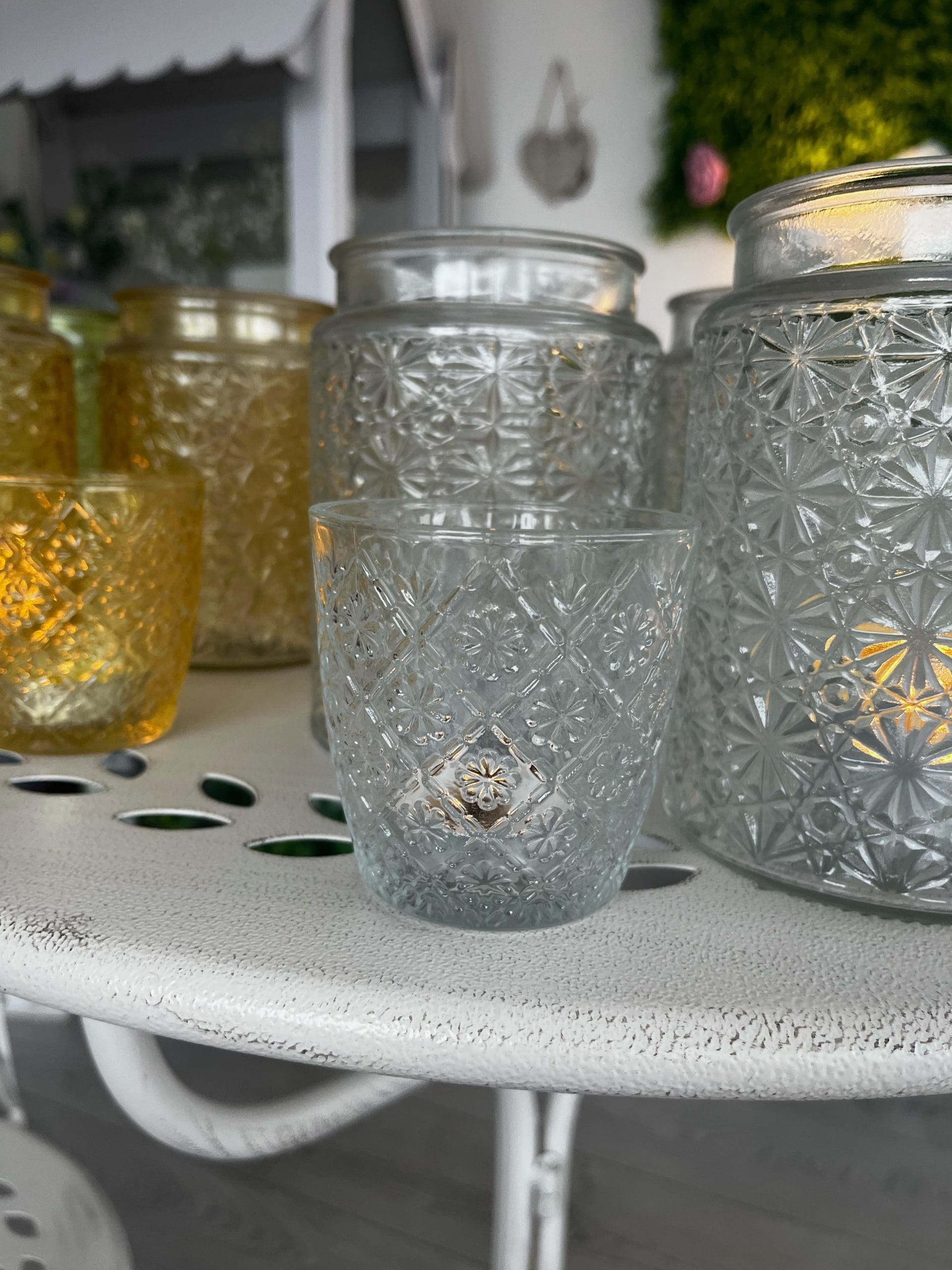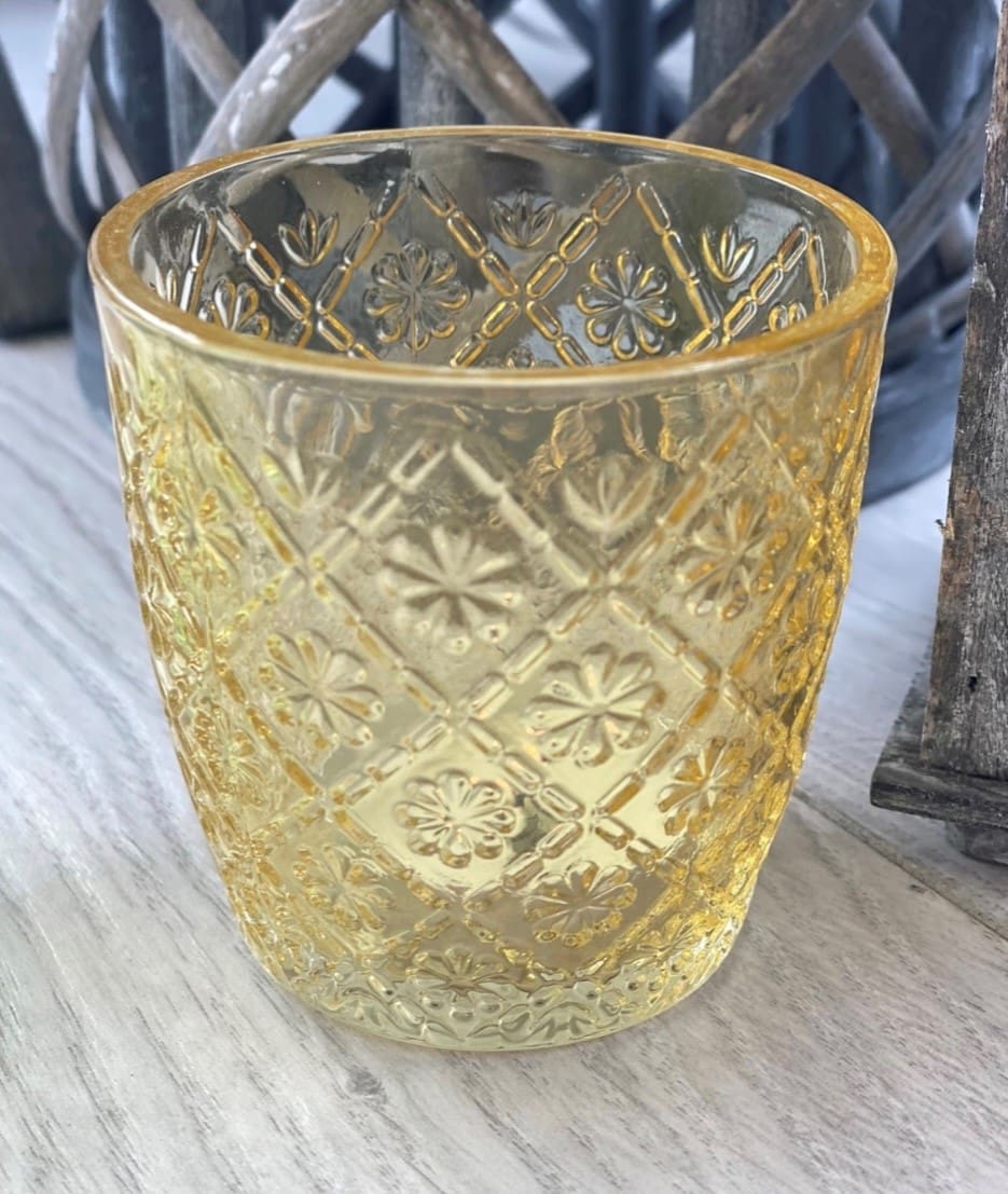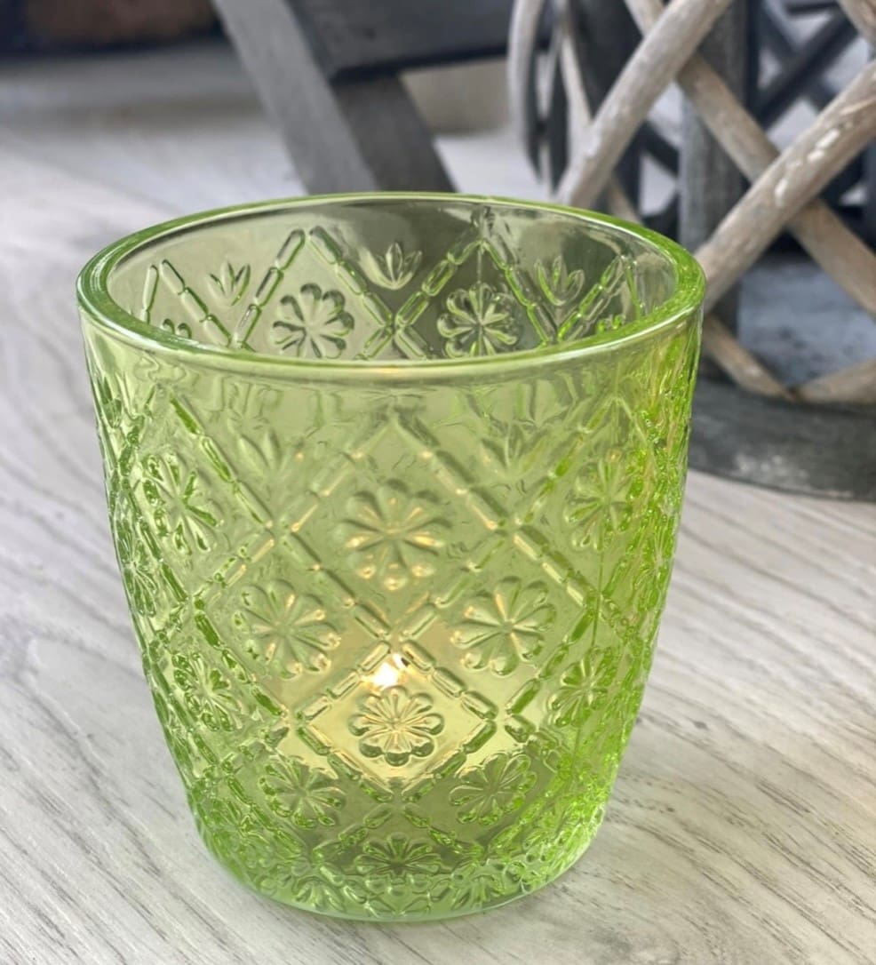 An assortment of 4 beautifully decorative glass t-light holders. Each has a retro flower design and comes in clear, pink, yellow & green design.