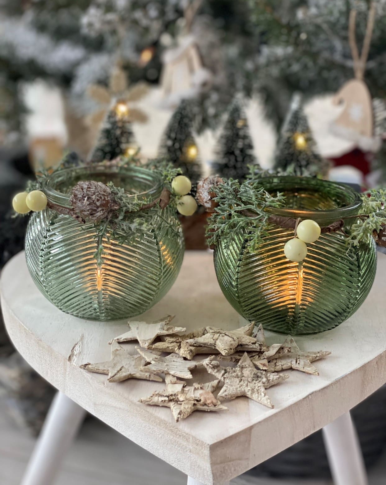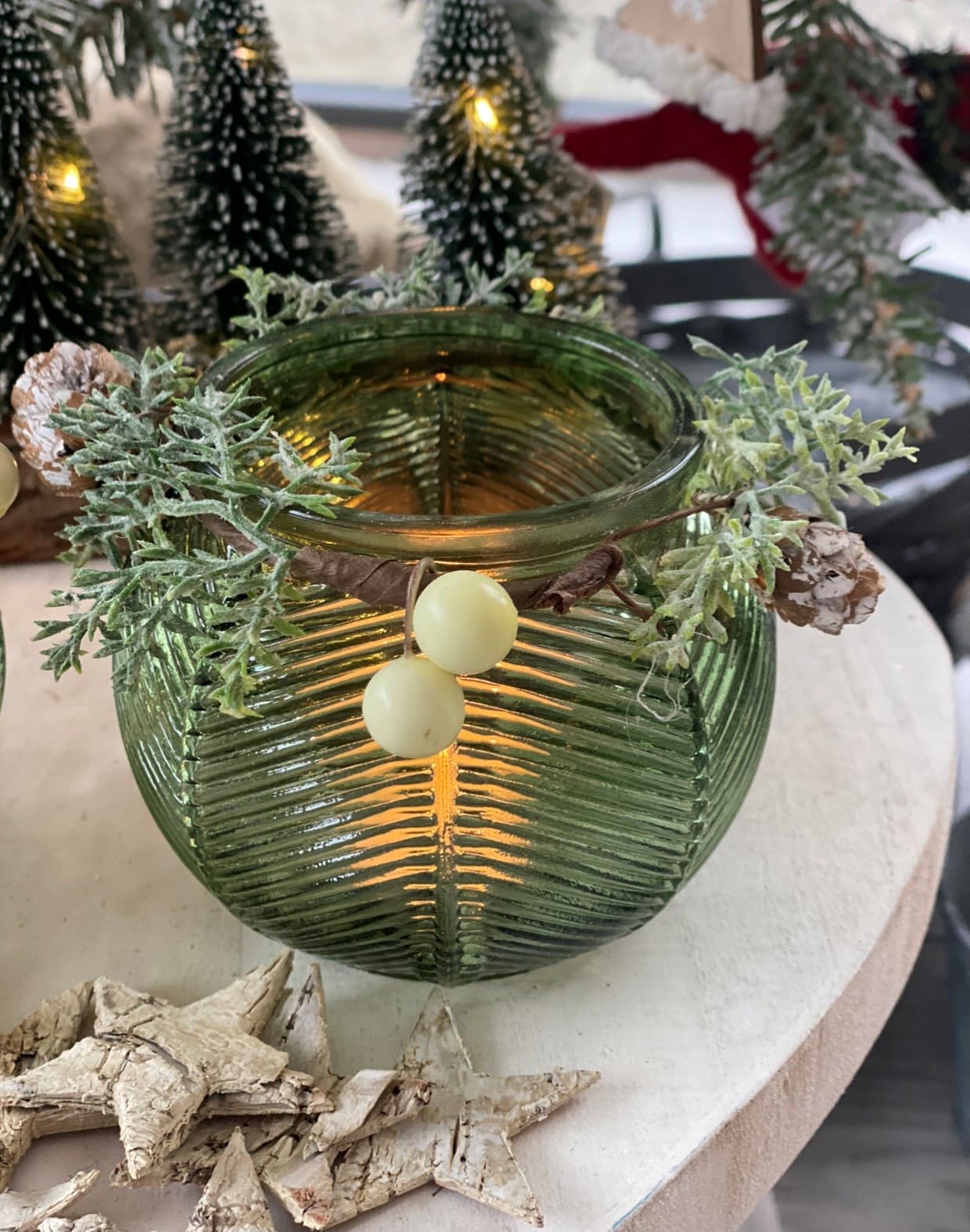 Glass Tealight Holder With Wreath In Sage Green And Pine Green.