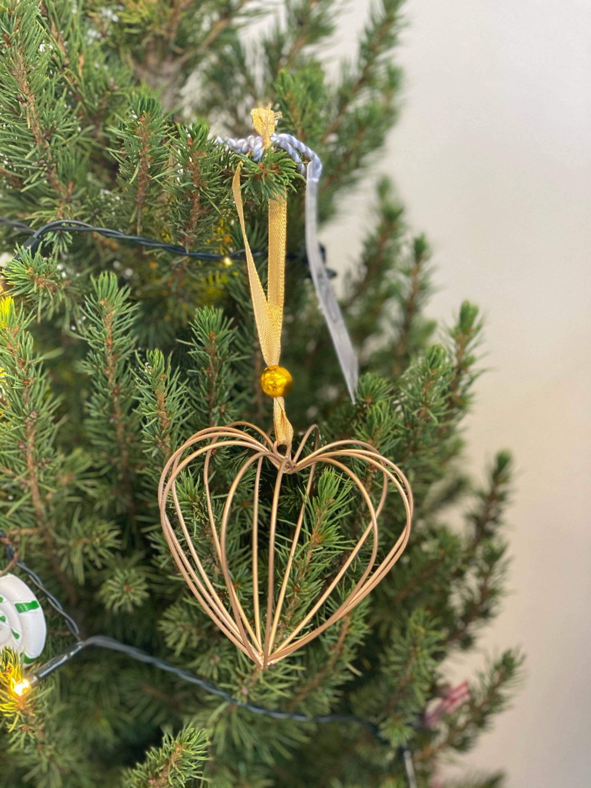 A chic and modern gold geometric tree decoration with bell and gold organza ribbon to hang. Size 12 x 7cm