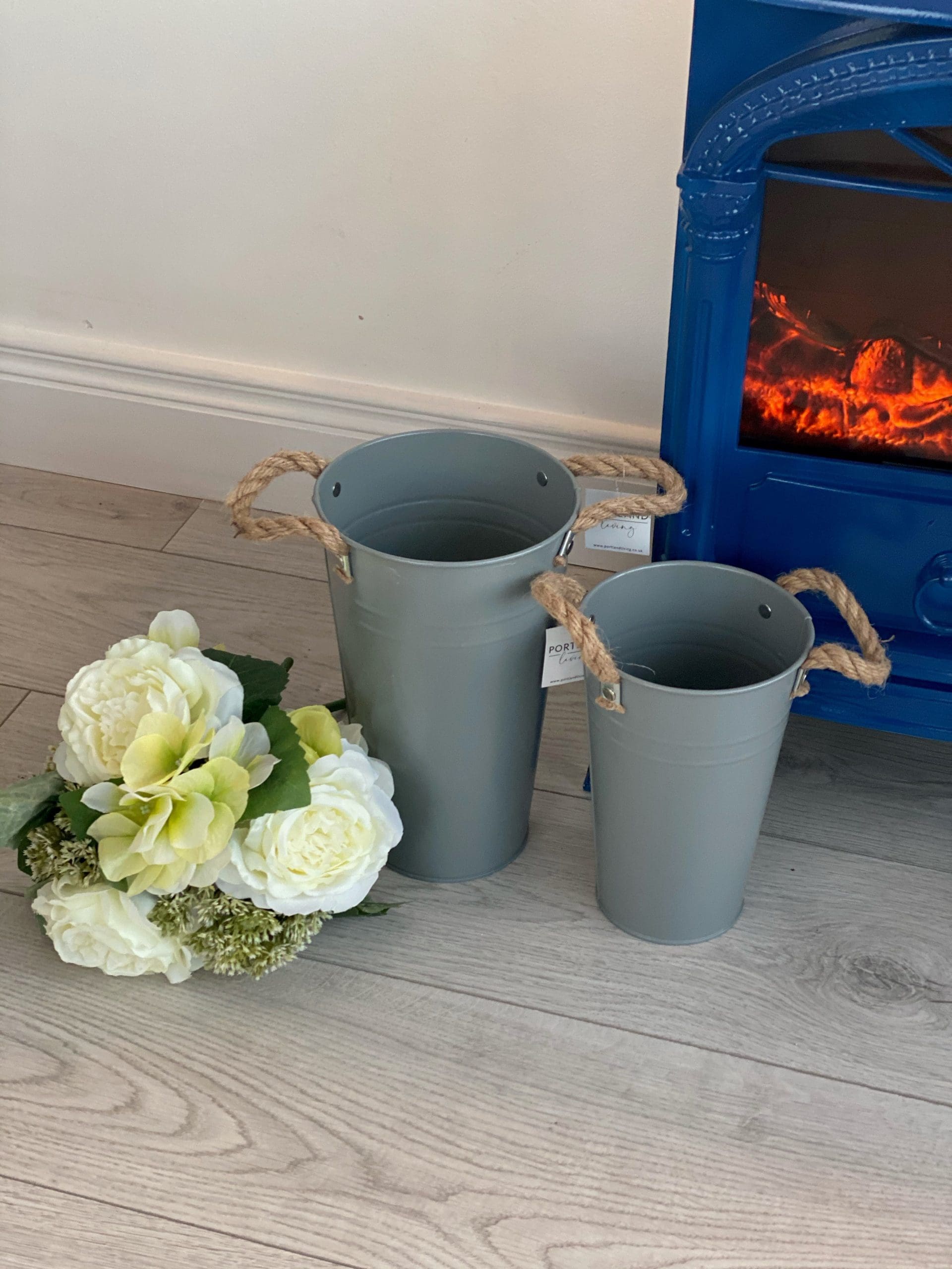 A rustic living flower bucket in grey. Complete with chunky rope handles. Size 20cm or 25cm