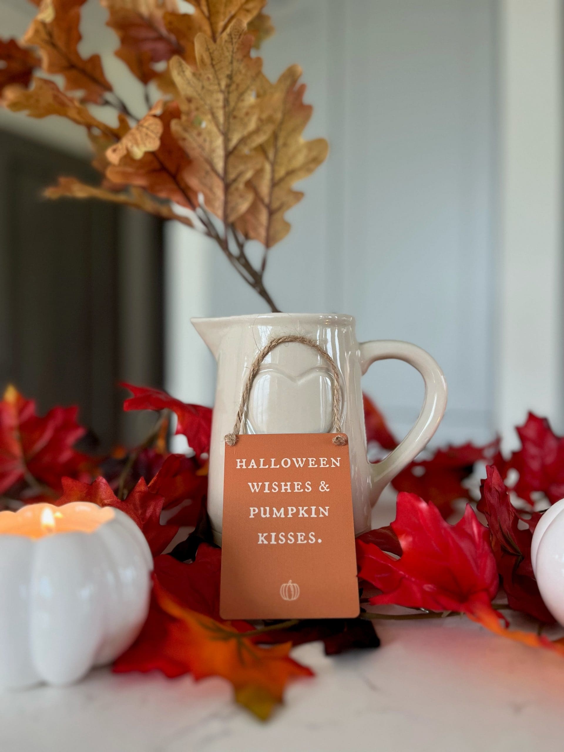A charming mini metal sign with a Halloween wishes slogan. Complete with rustic jute string for hanging. Size 9 x 6.5cm