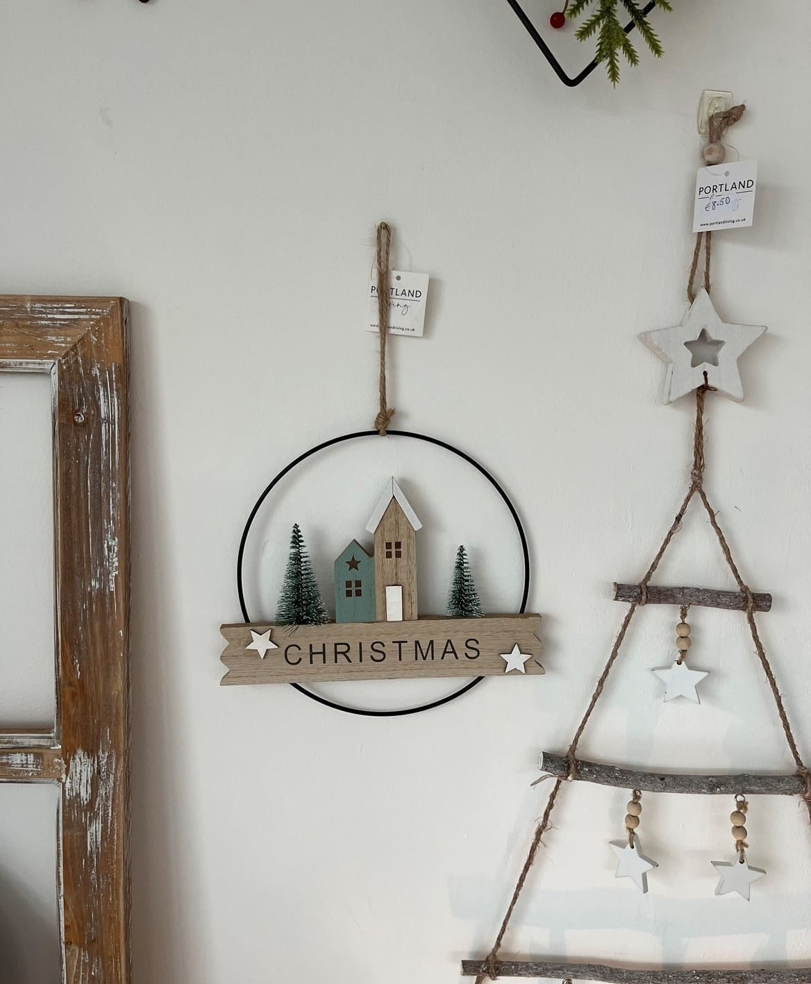 A stylish hanging wreath sign with a charming woodland street scene and artificial trees. Size 20cm