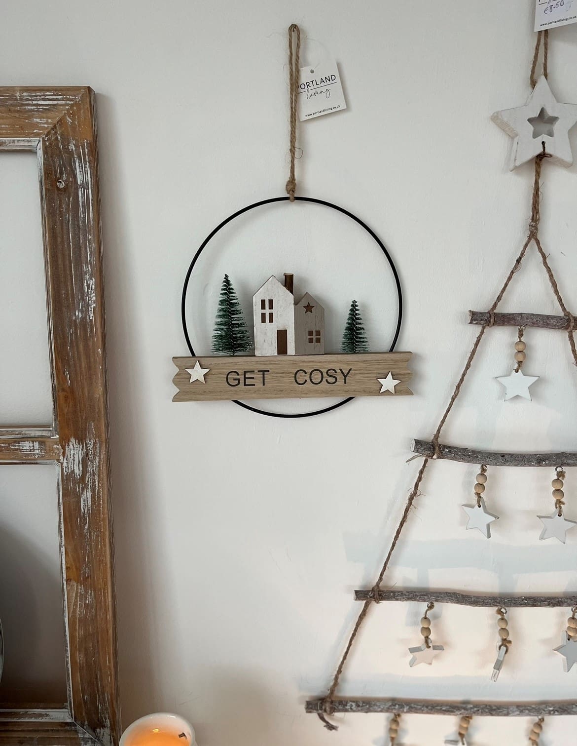 A chic nordic inspired wreath with a contemporary street scene and Get Cosy sign. Size 20cm