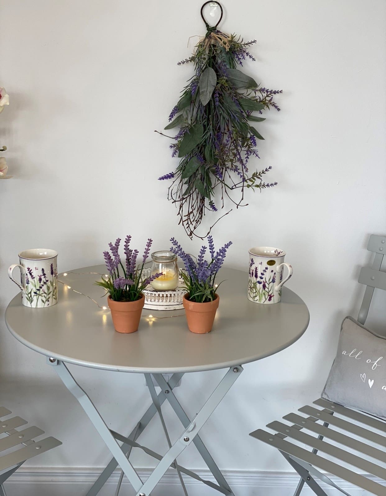 A large posy of beautifully coloured artificial lavender and leaves. Bound together with natural raffia.