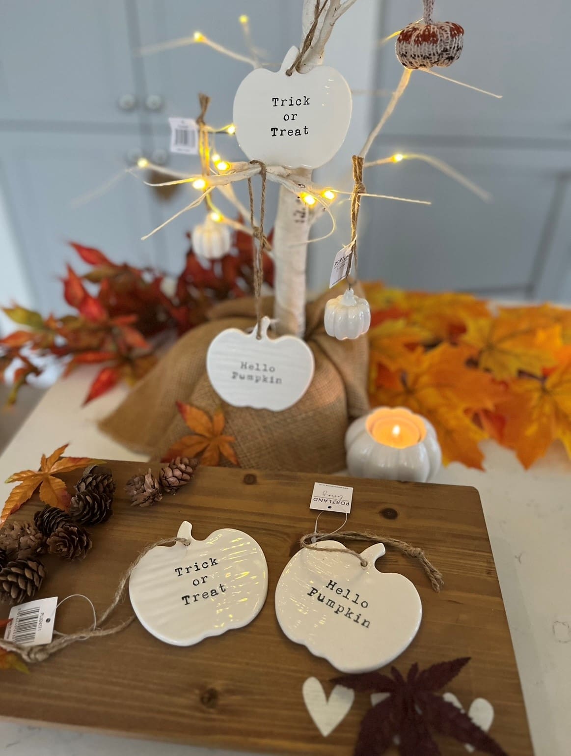 Hello Pumpkin. A chic ceramic sign with a stamped slogan and jute string hanger. Size 9cm