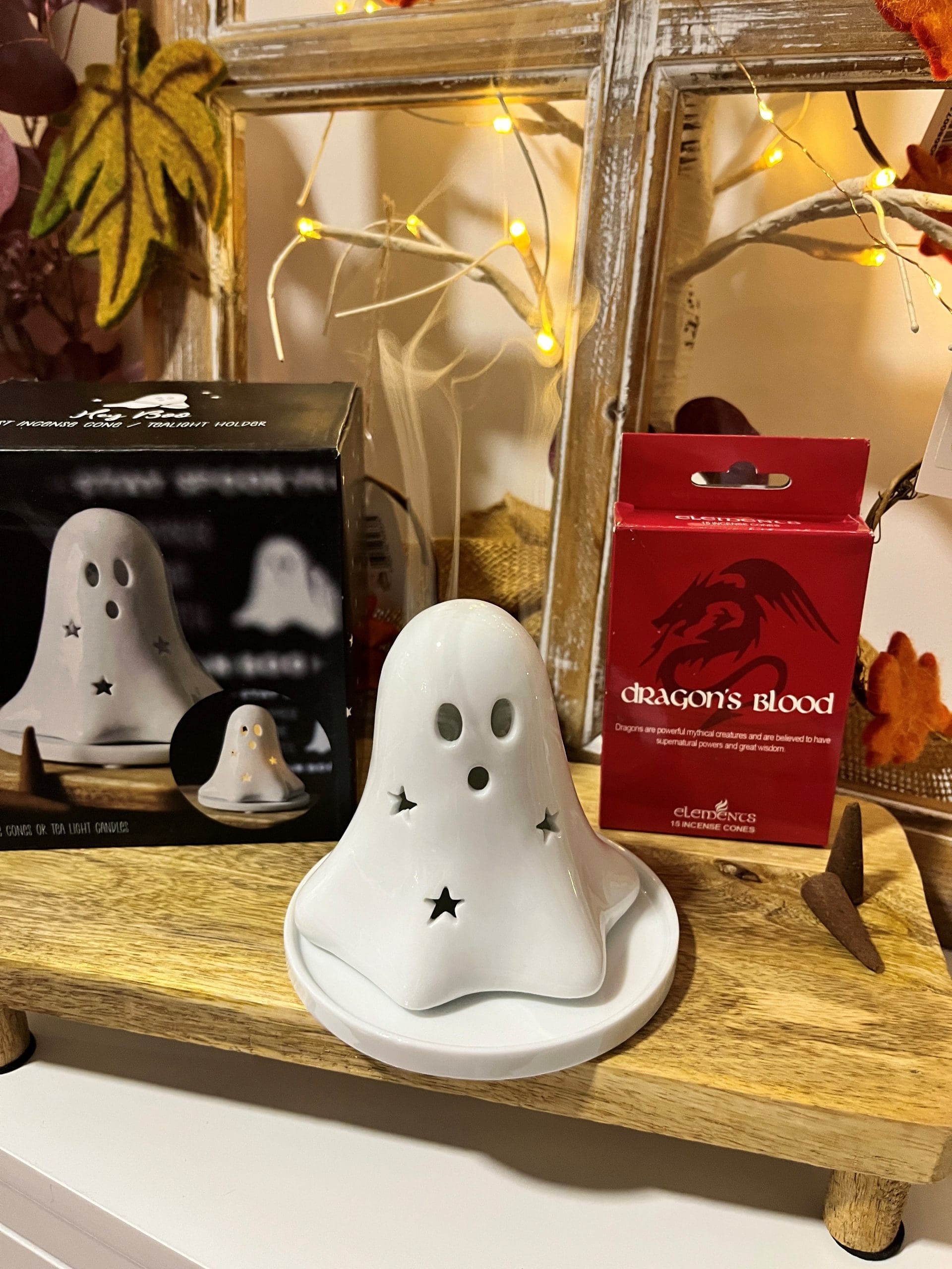 Spook up this Halloween decor with a friendly, little ghost. This versatile ceramic tealight holder doubles as an incense cone holder (as pictured), allowing you to choose between a spooky glow or bewitching fragrance, sold as a single, dual-purpose holder. Dimensions: H10cm x 10.8cm x D10.8cm