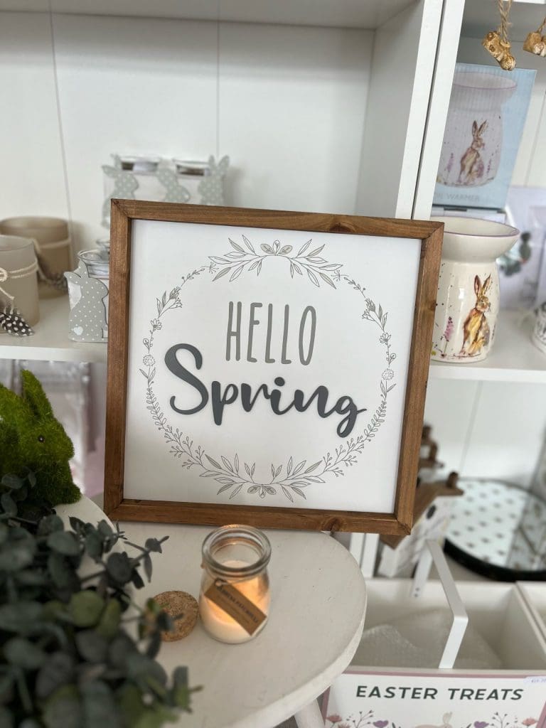 HELLO SPRING FRAMED PLAQUE WHITE WOOD WITH WREATH