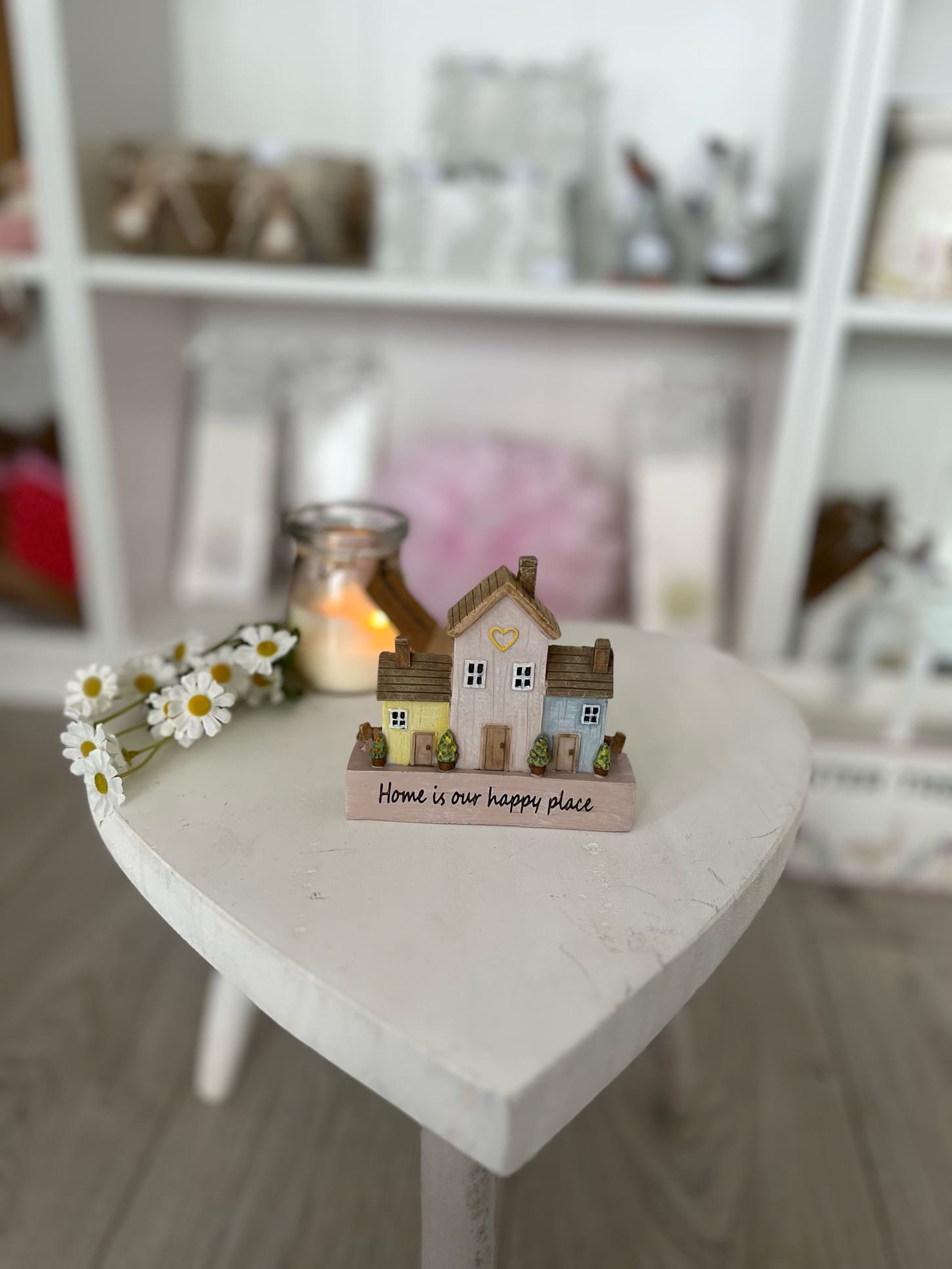 A sweet ornament displaying 3 houses with cute heart and plant details. Complete with the phrase “Home is Our Happy Place” Size 10×2.5×9.5cm