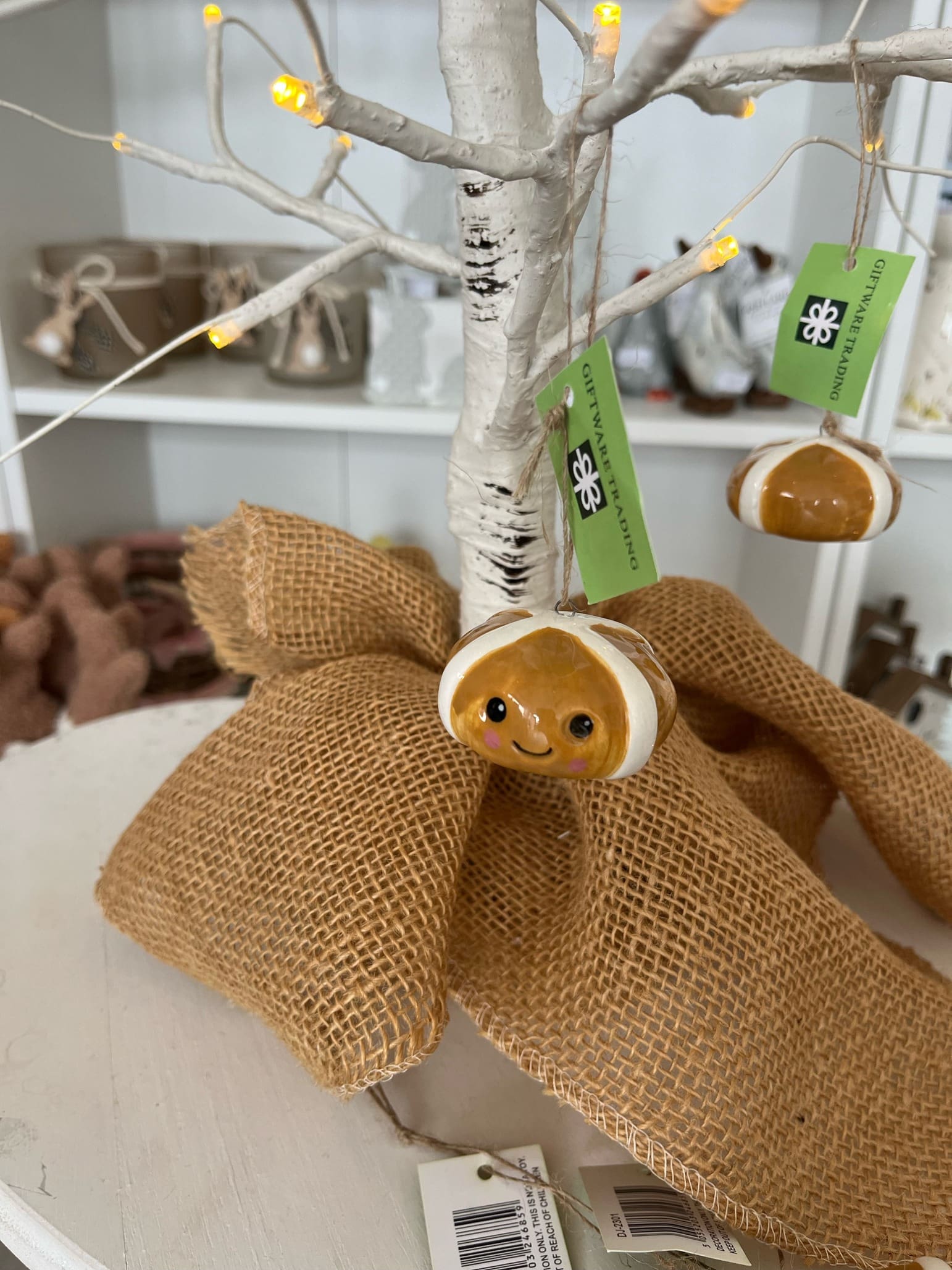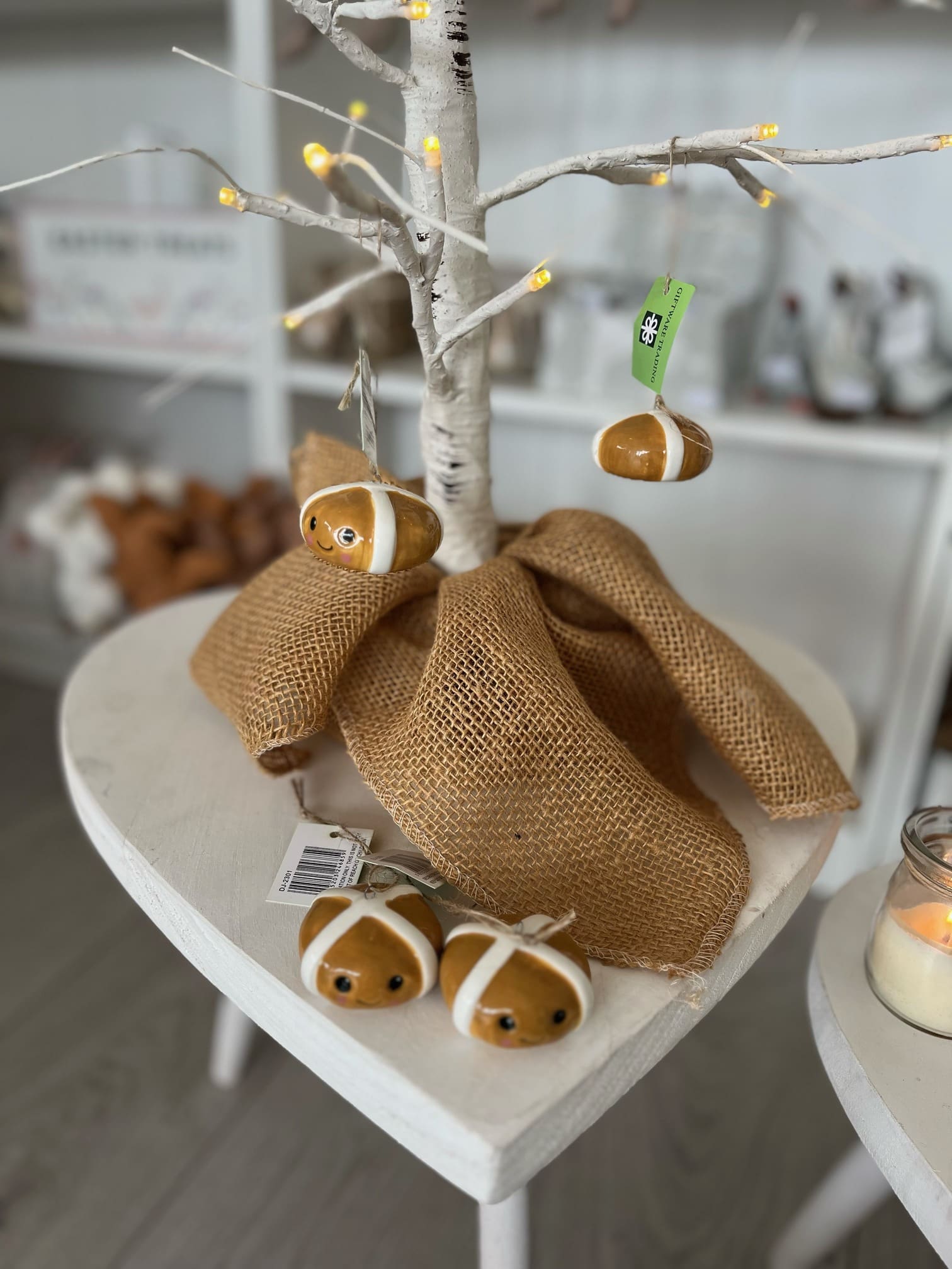 An adorable ceramic hot cross bun hanging decoration with a smiley face. Size : 4.7cm