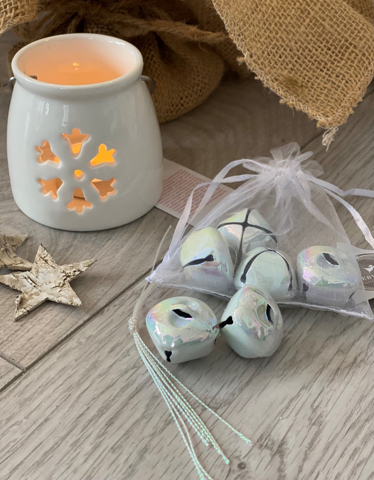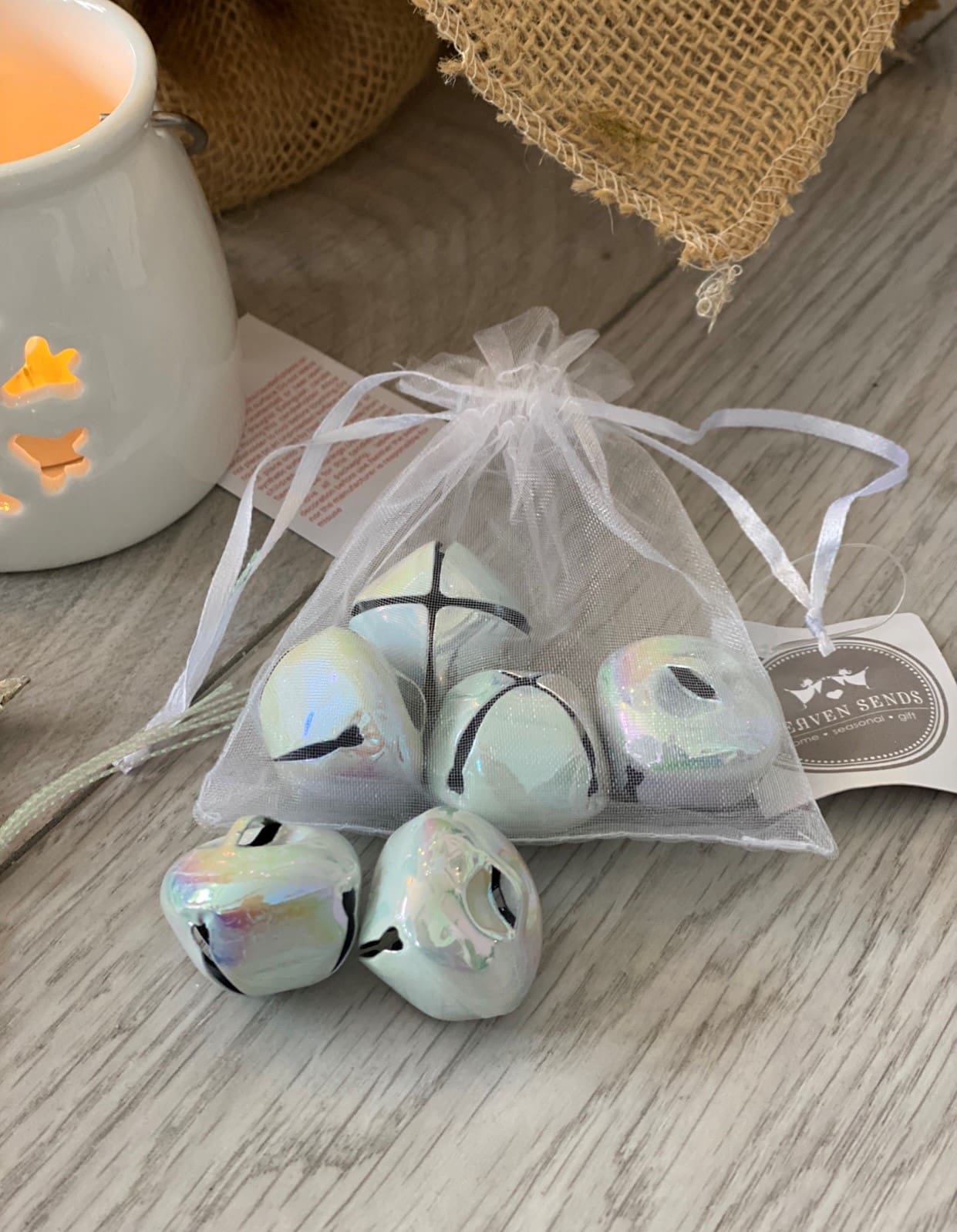 An organza bag filled with iridescent toned jingling bells