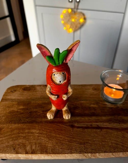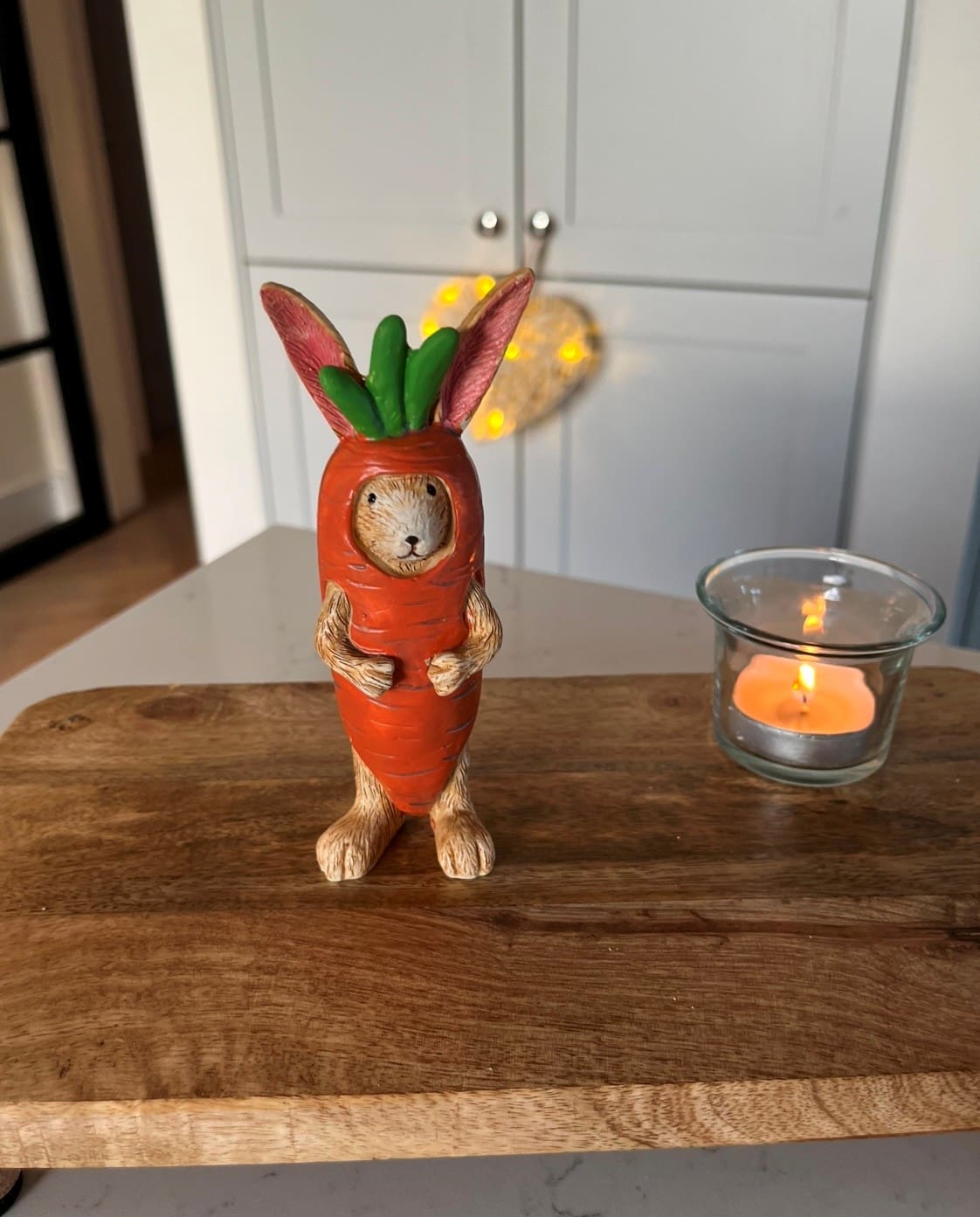 This charming figurine features a cute rabbit dressed in a carrot suit, adding a touch of whimsy to any home decor. Perfect for animal lovers and collectors, this delightful piece will bring joy and character to any space.