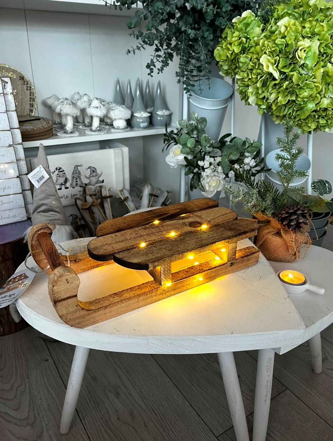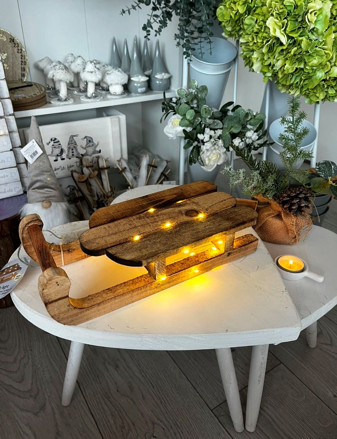 Wooden Sledge Decoration With Battery Powered LED Lights All Over Which Have a 6hr Timer Function. Designs Priced Individually Batteries not included.