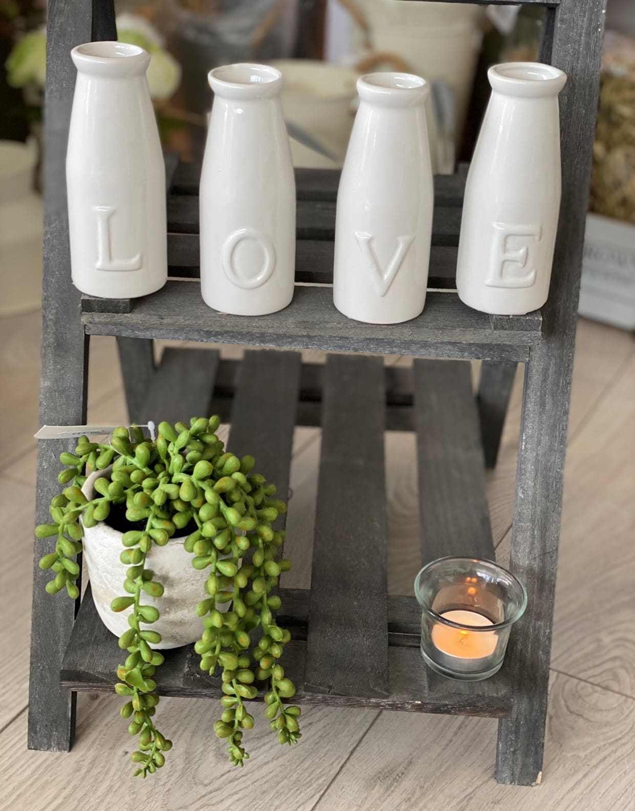 A set of simple white toned ceramic milk bottles, each embossed with a letter that spells out LOVE