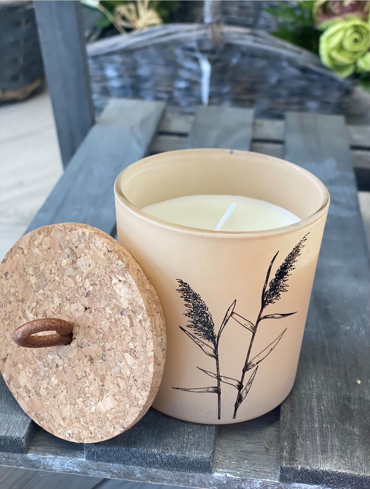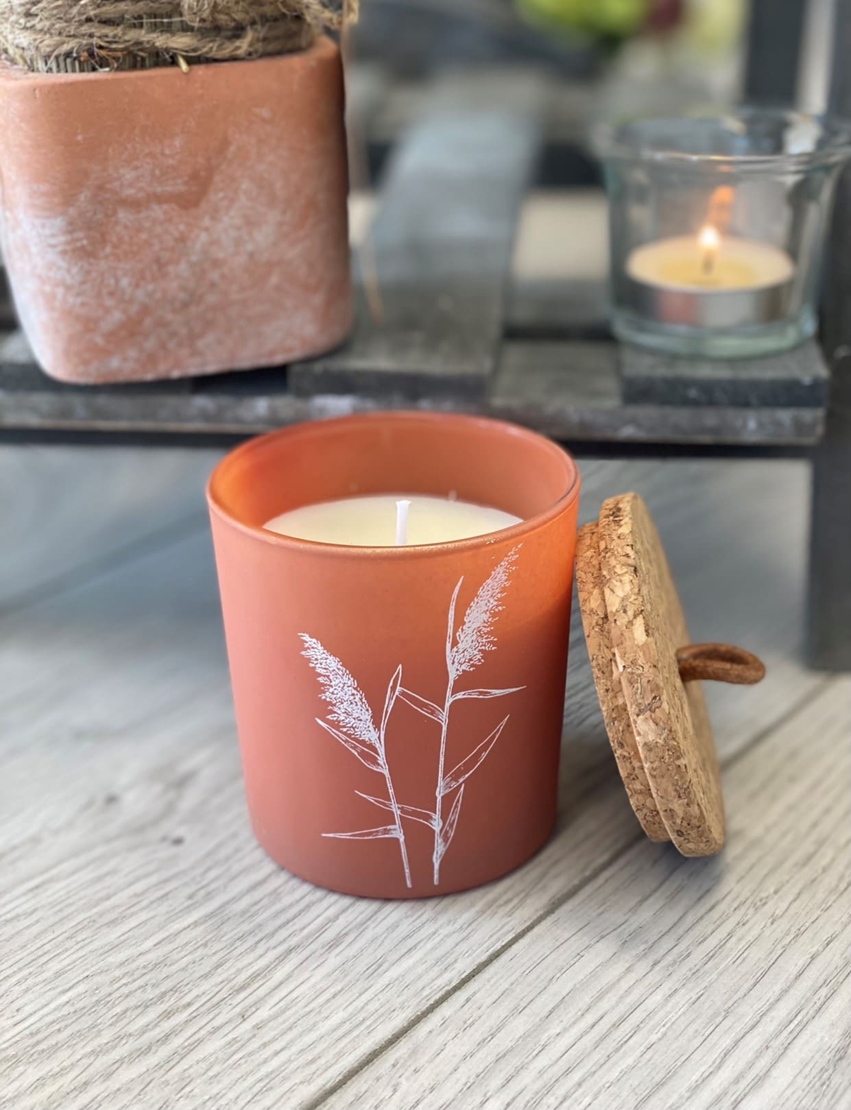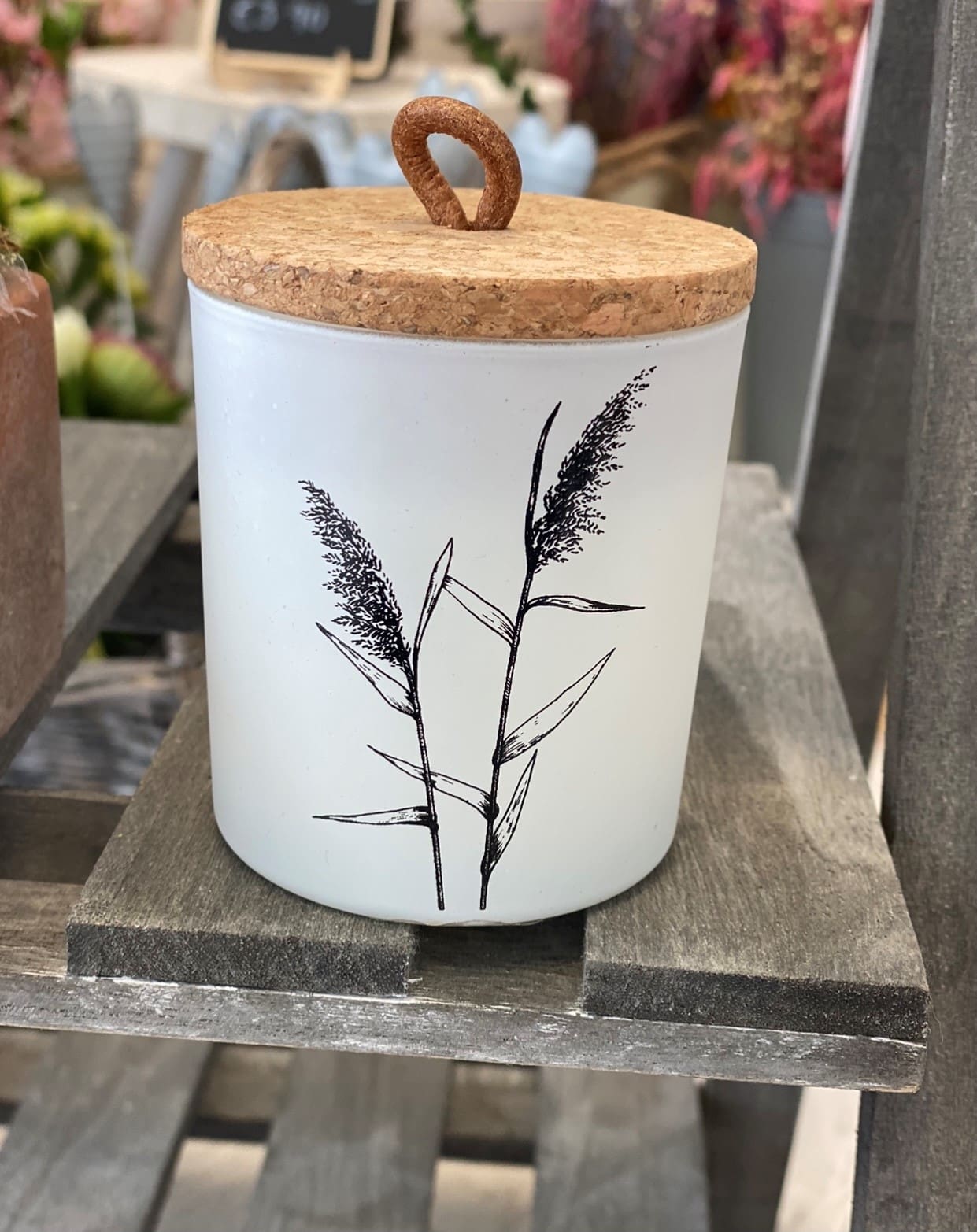 An assortment of natural toned candle pots, each set with a pampas grass decal and simple cork topped lid