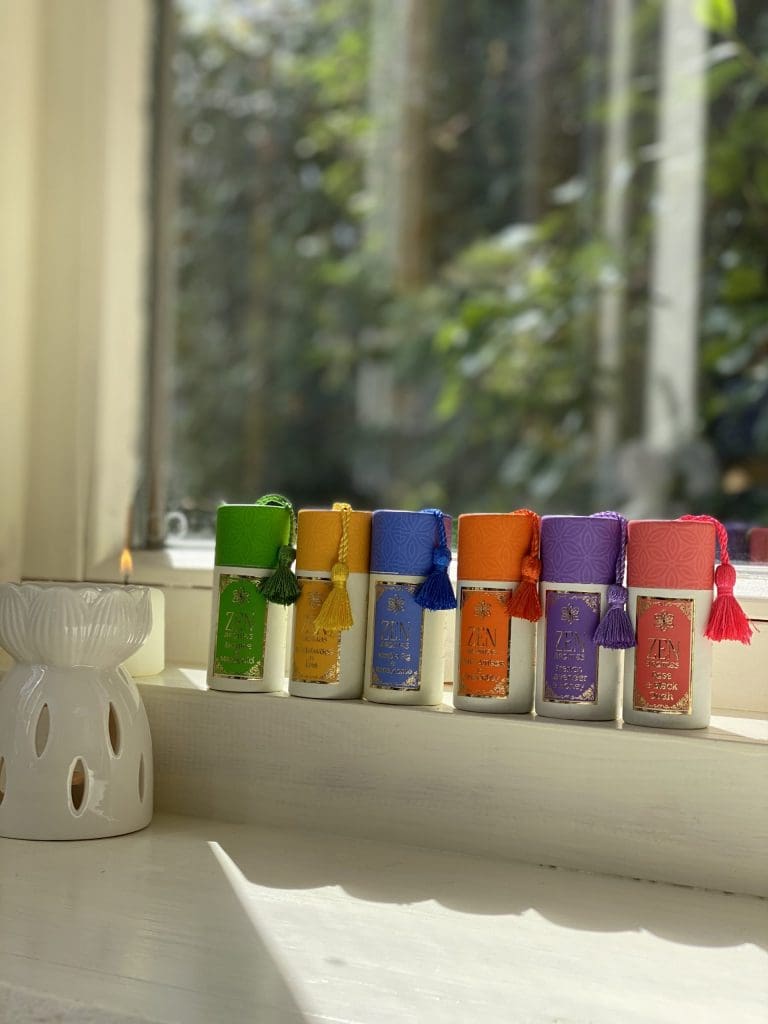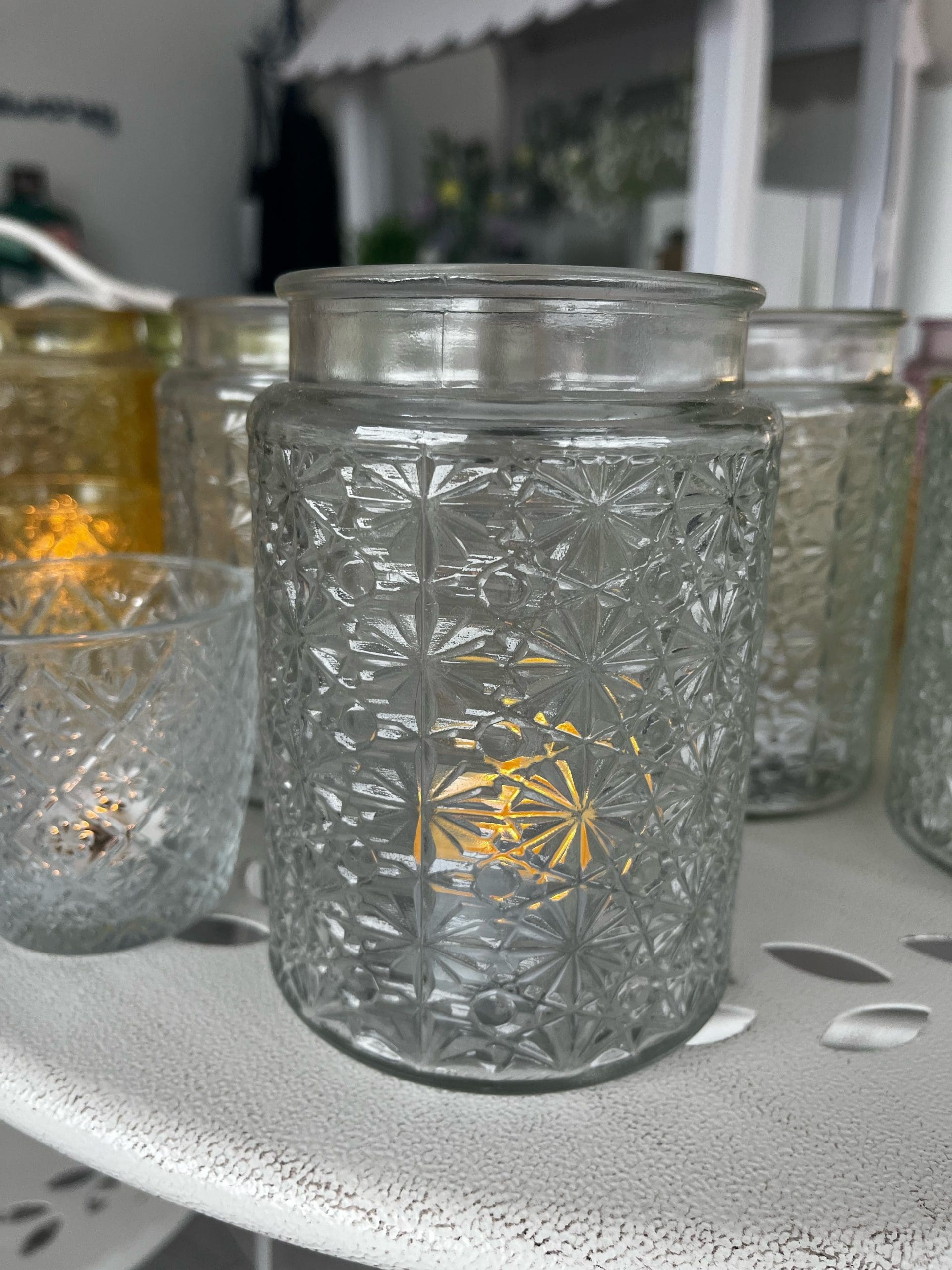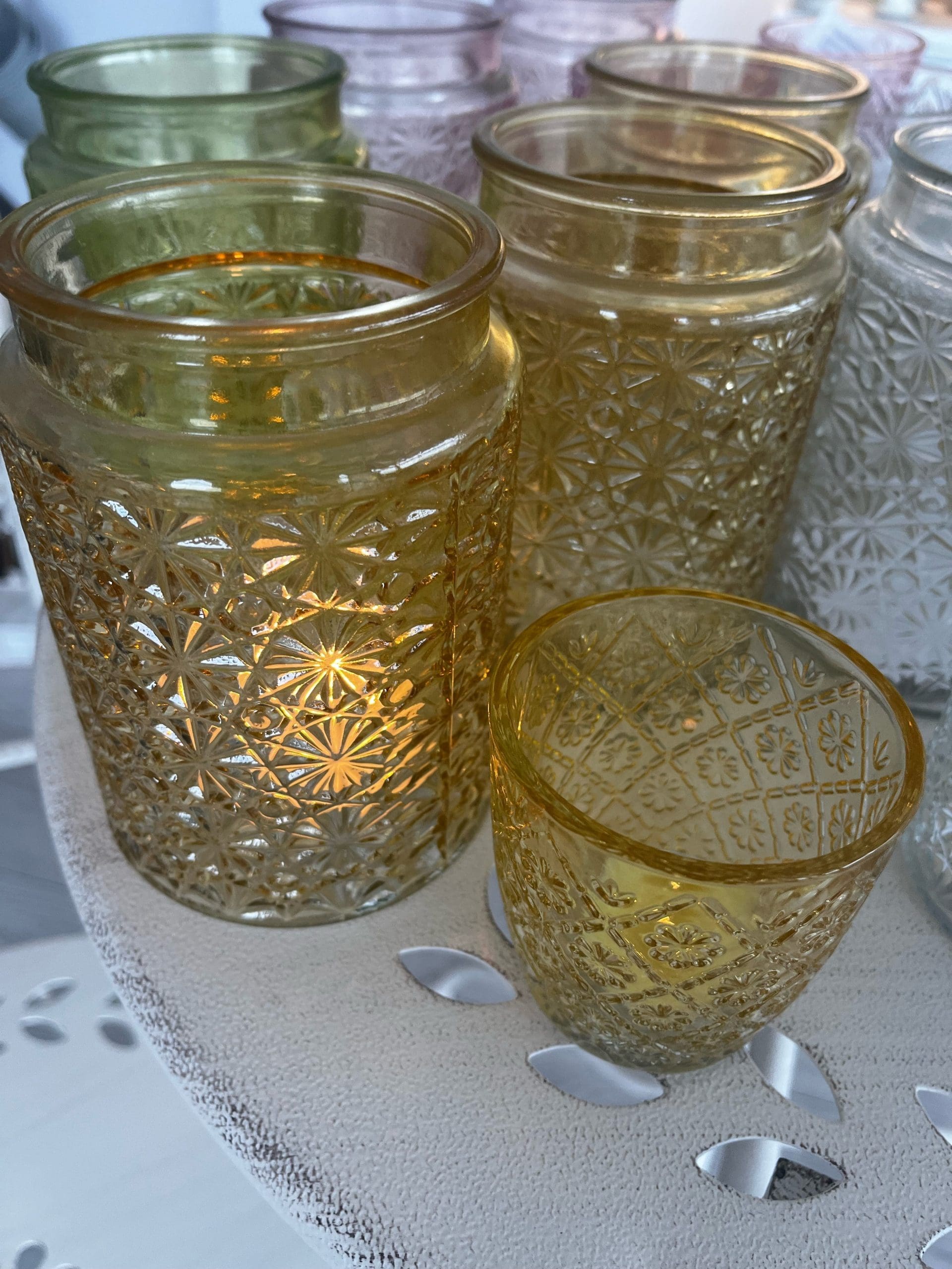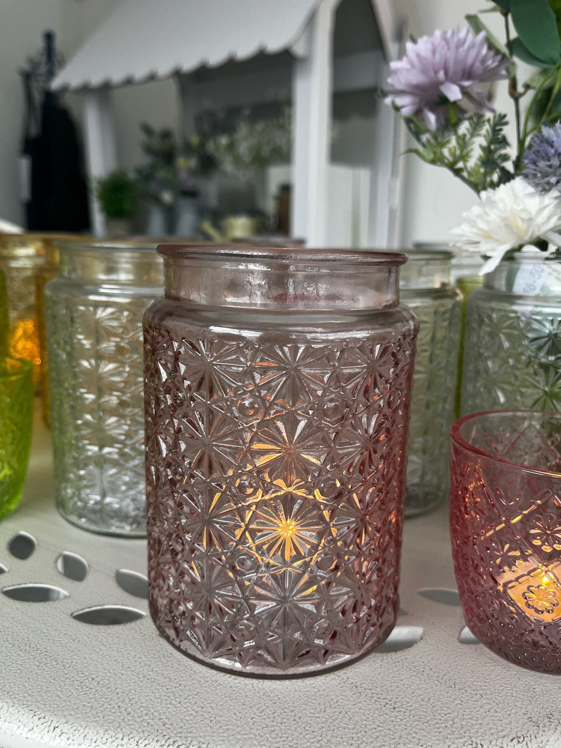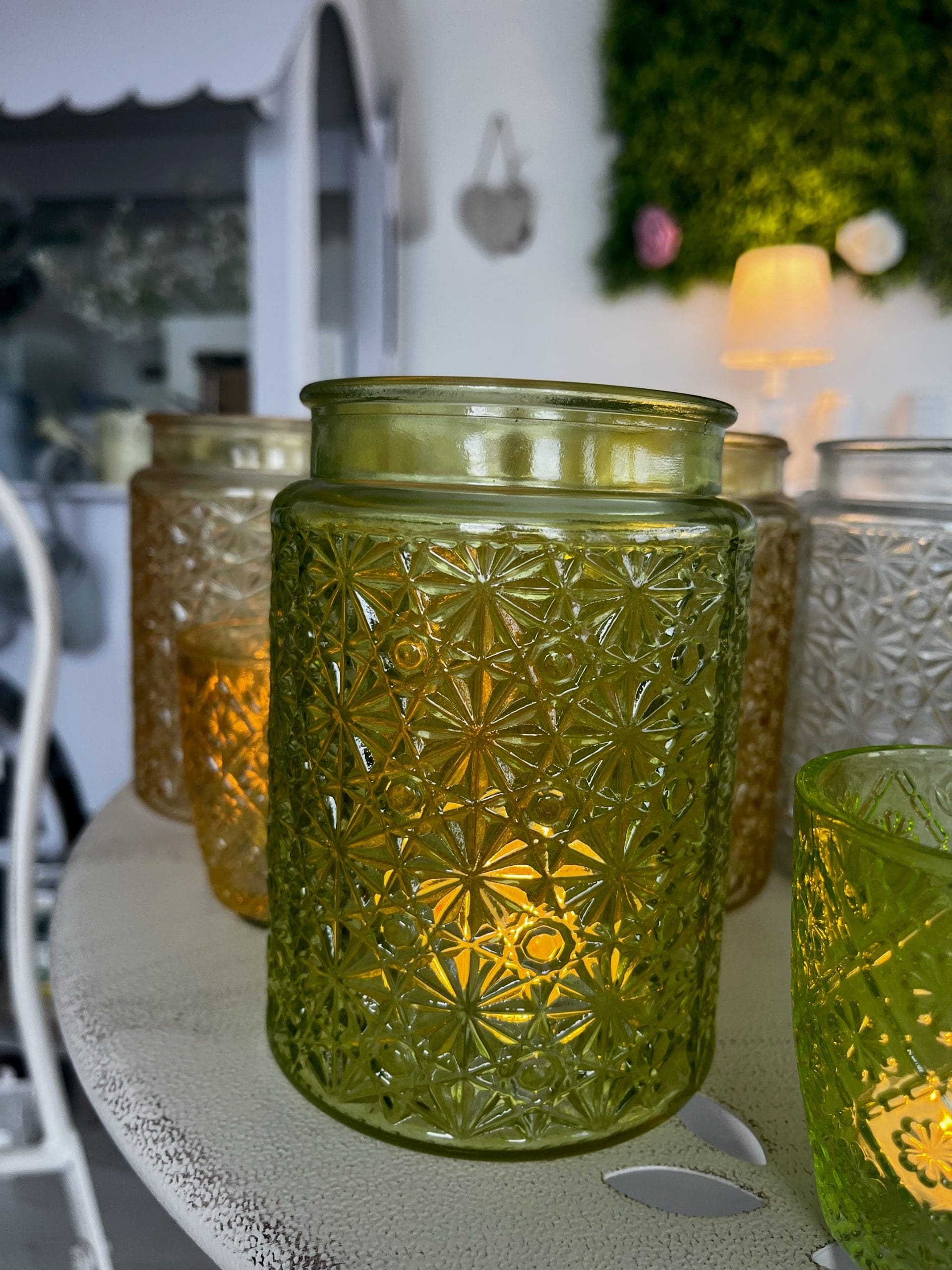 An assortment of 4 beautifully decorative glass candle holders. Each has a retro flower design and comes in clear, pink, yellow & green