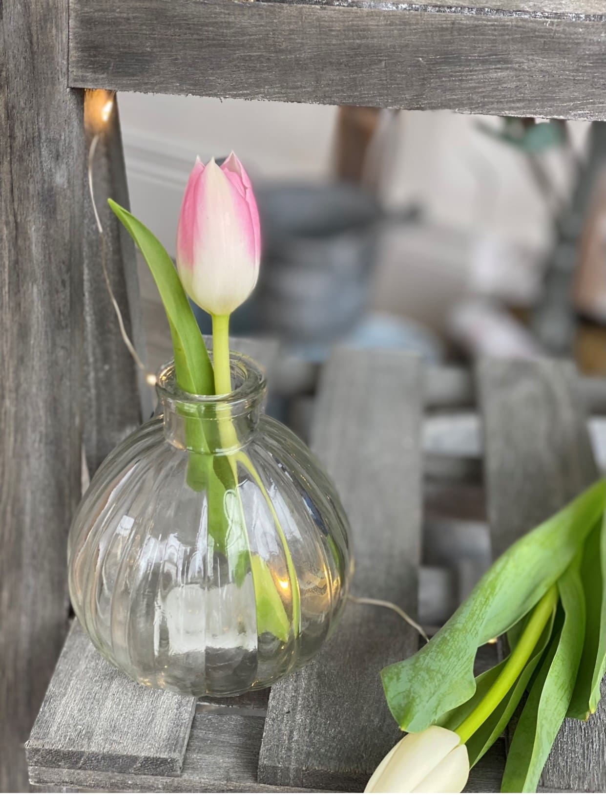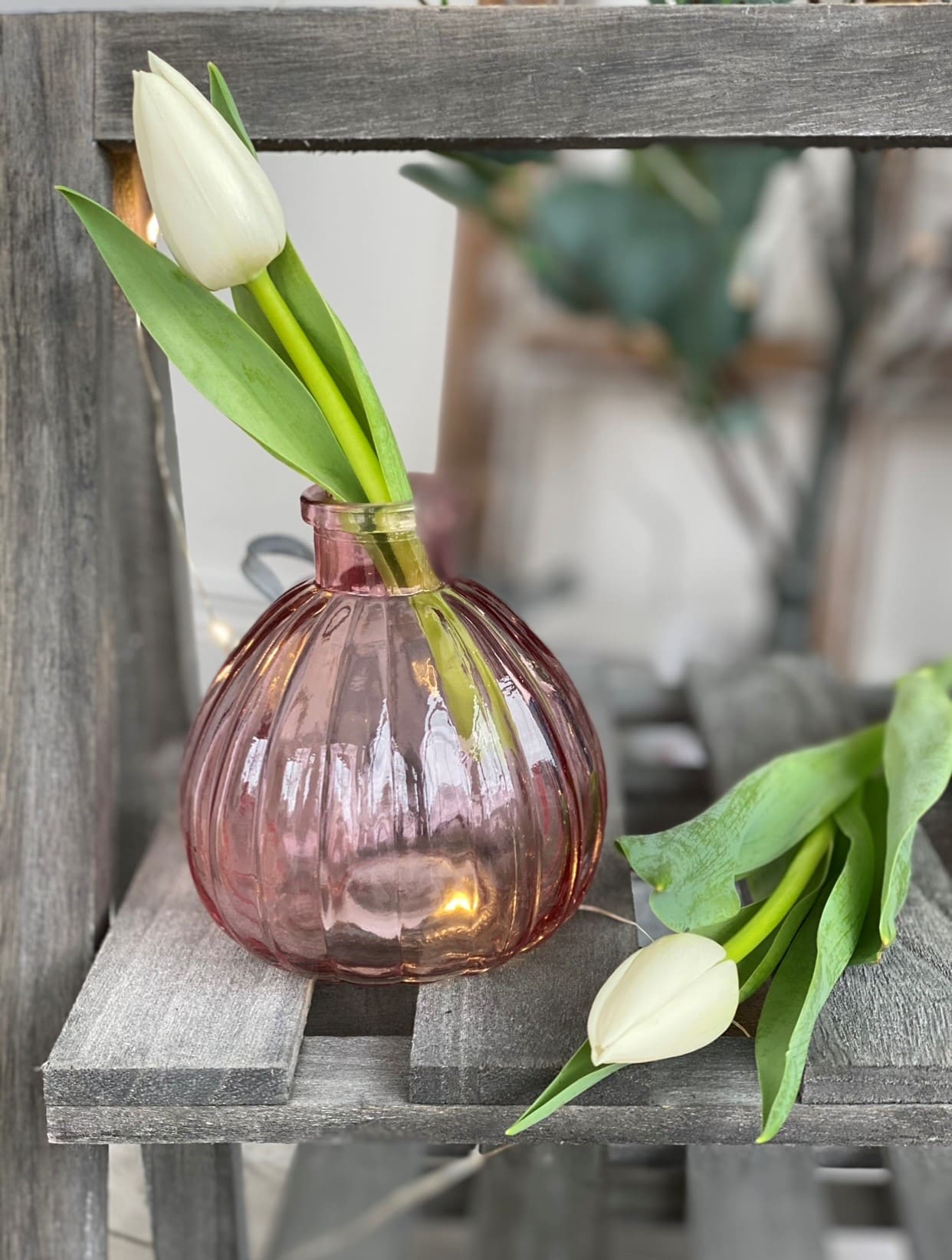 An assortment of 2 pretty glass vases in pink and clear designs. Display as pictured or add your favourite stems. 2 assorted designs, Size 8.5 x 9cm