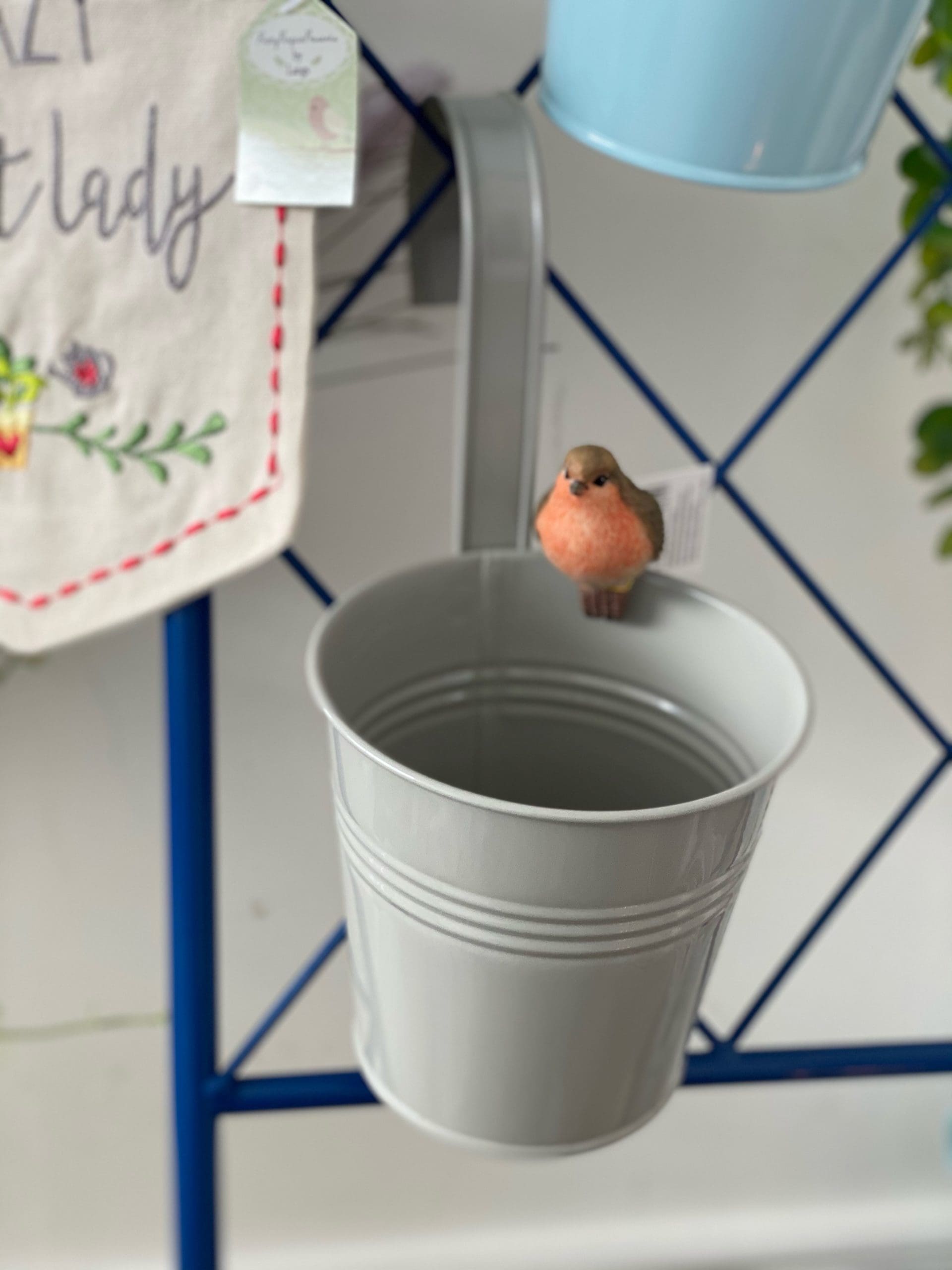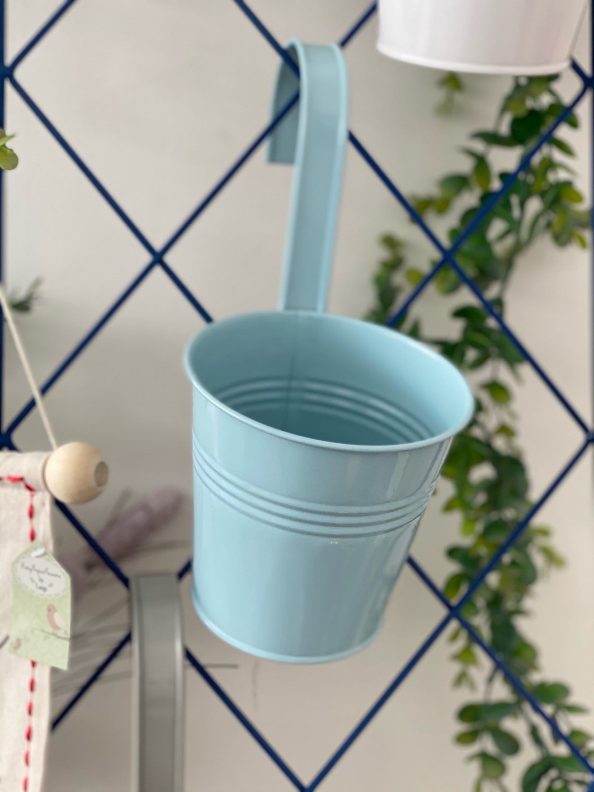 A mix of 3 blue, grey and white hanging planters. 3 assorted designs, individually priced Size 11 x 10.5cm + 10cm handle