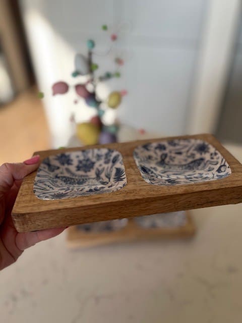 Made from wood and enamel, it is perfect for serving packaged snacks or displaying trinkets.
