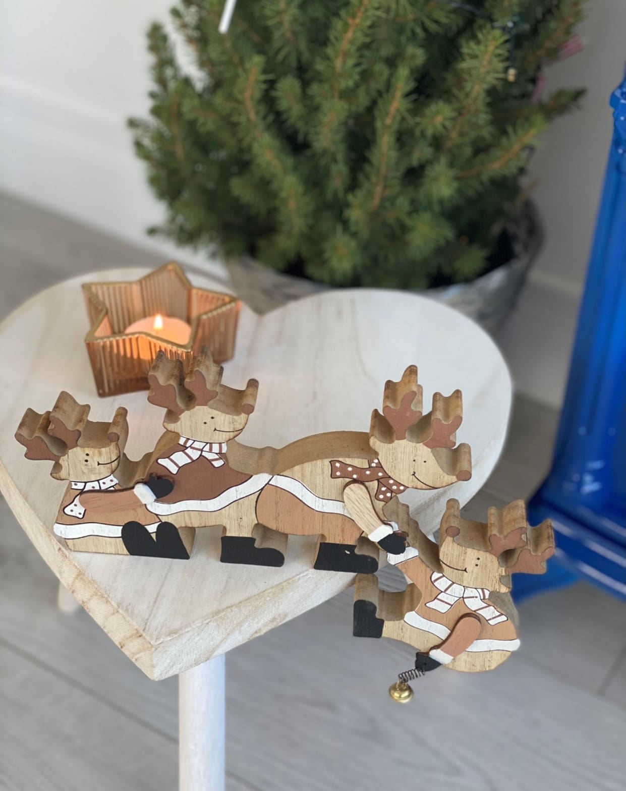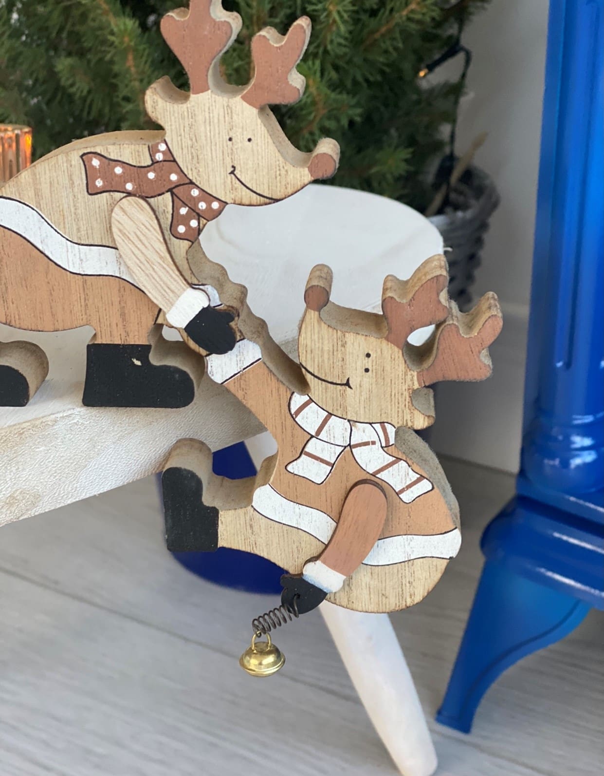 Reindeer edge hanger made from wood in neutral browns, perfect for sitting on the edge of shelves or the mantelpiece.