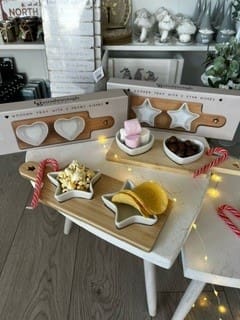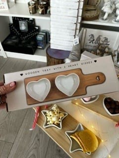 Wooden snack tray with 2 ceramic heart dishes. Size 27.5cm