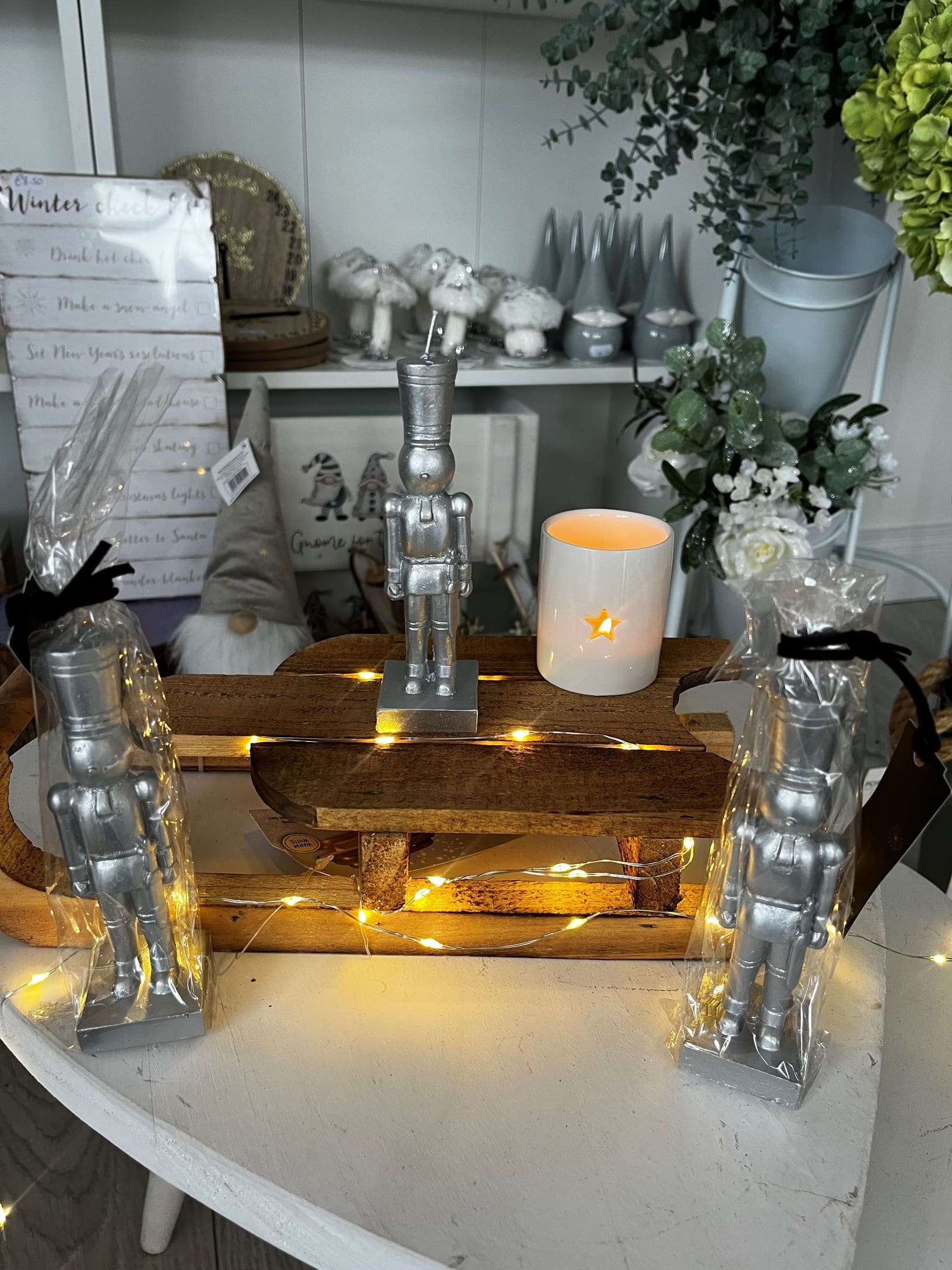 A handmade nutcracker candle in metallic silver. Complete with gift wrap and tag. Burn Time: 2 hours Size 13cm