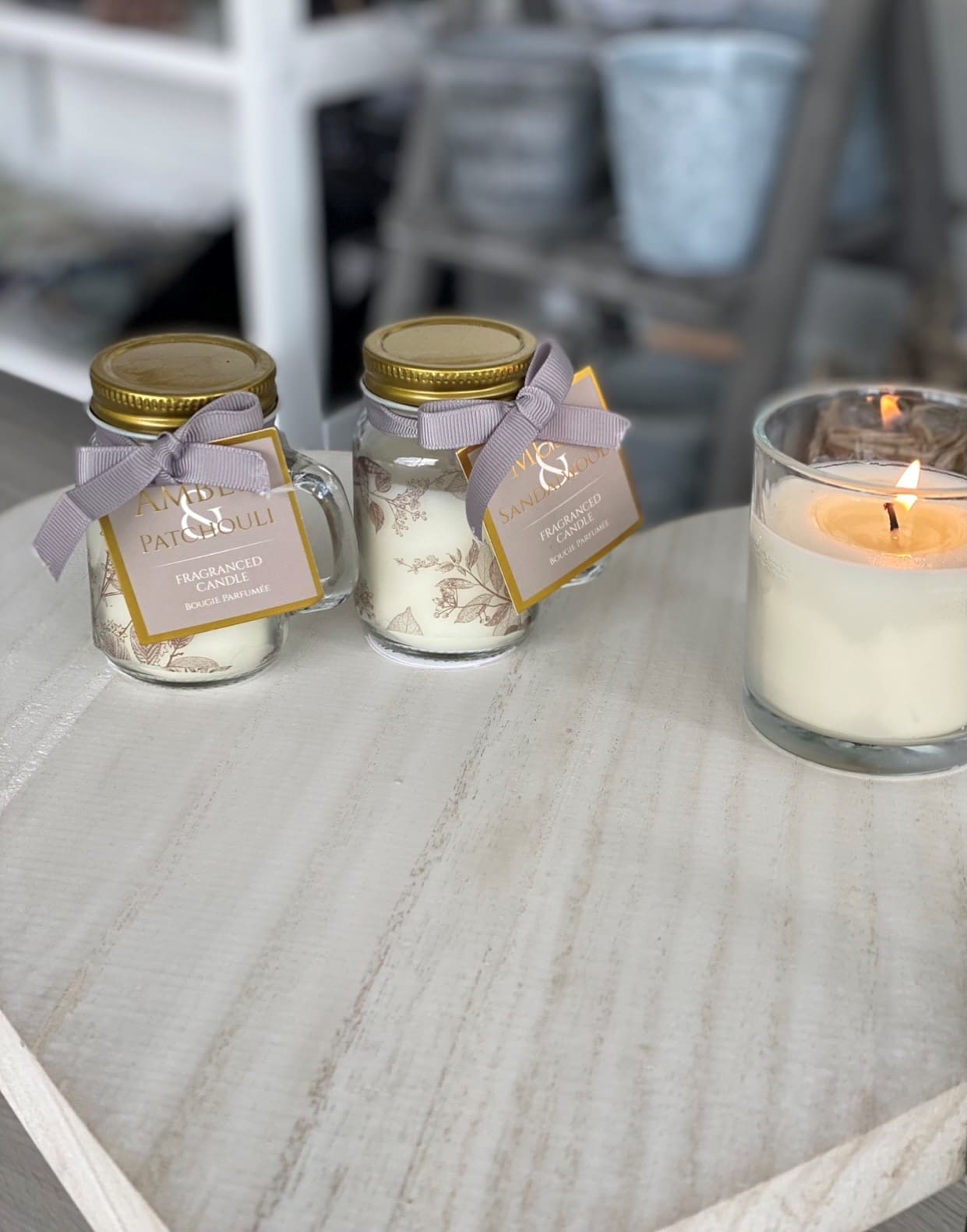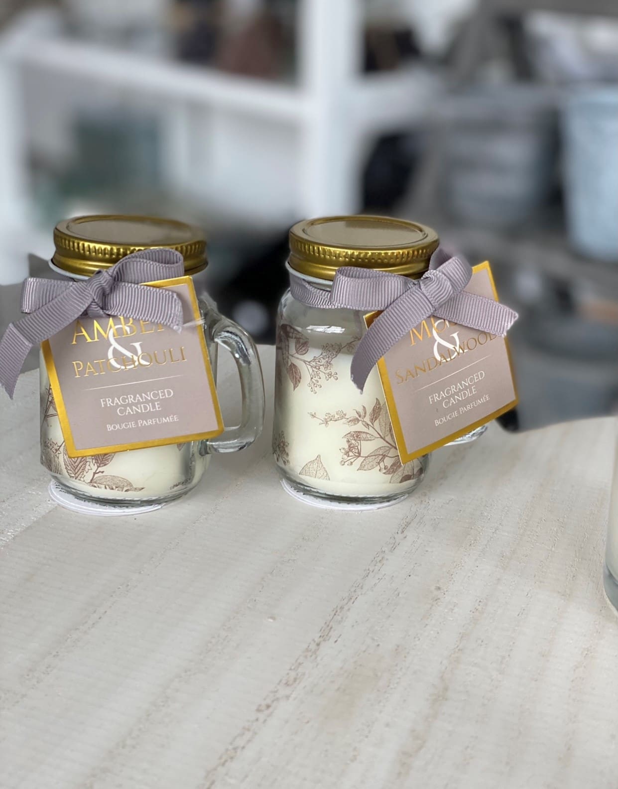 Scented candle in either Amber & Patchouli or Musk & Sandalwood, within small Mason Jar embellished with Skeletal Leaf motif.