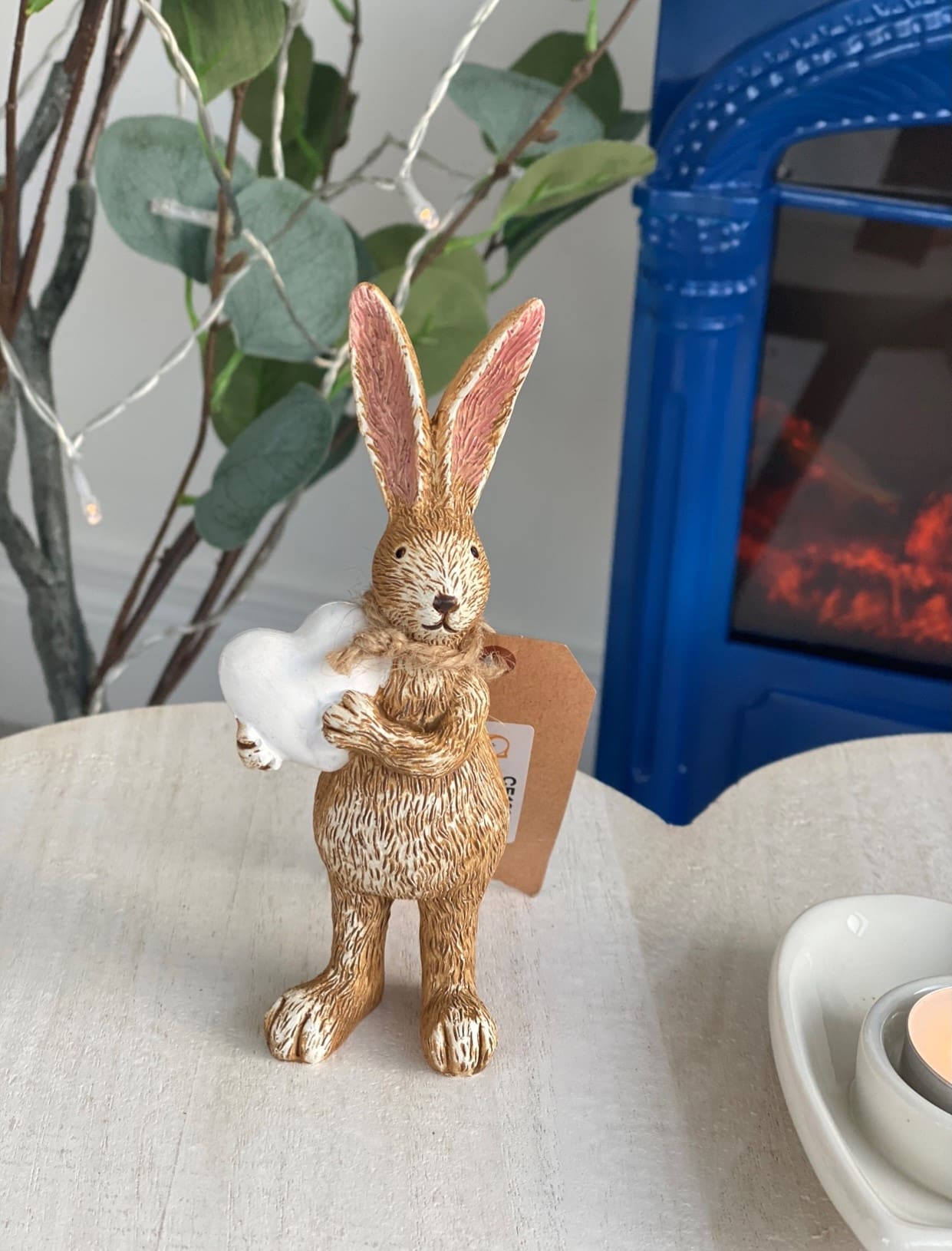 A range of adorable resin rabbit ornaments. This standing resin rabbit is 14 cm tall and is holding a white heart.This shelf sitting resin rabbit is 18 cm tall, has dangly legs and is holding a white heart