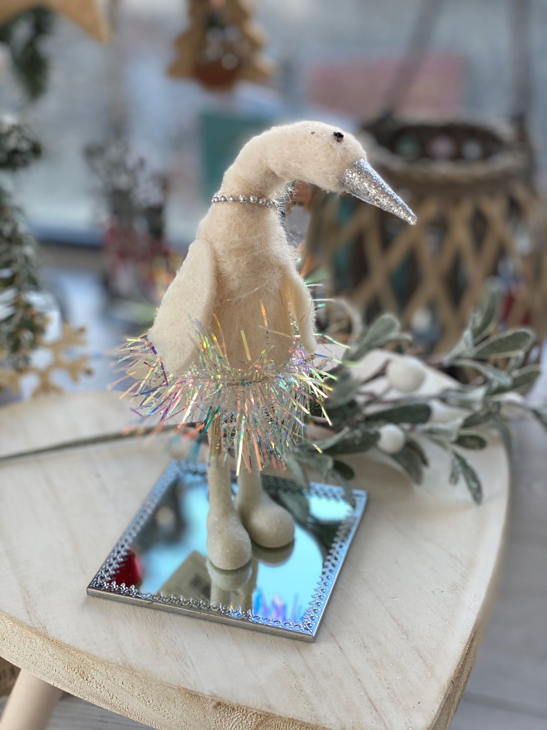 Dressed up in her best tinsel skirt, this cute standing woollen swan will be sure to add a sparkly touch to any Christmas decor