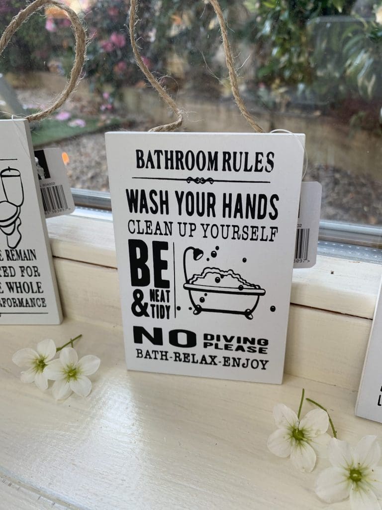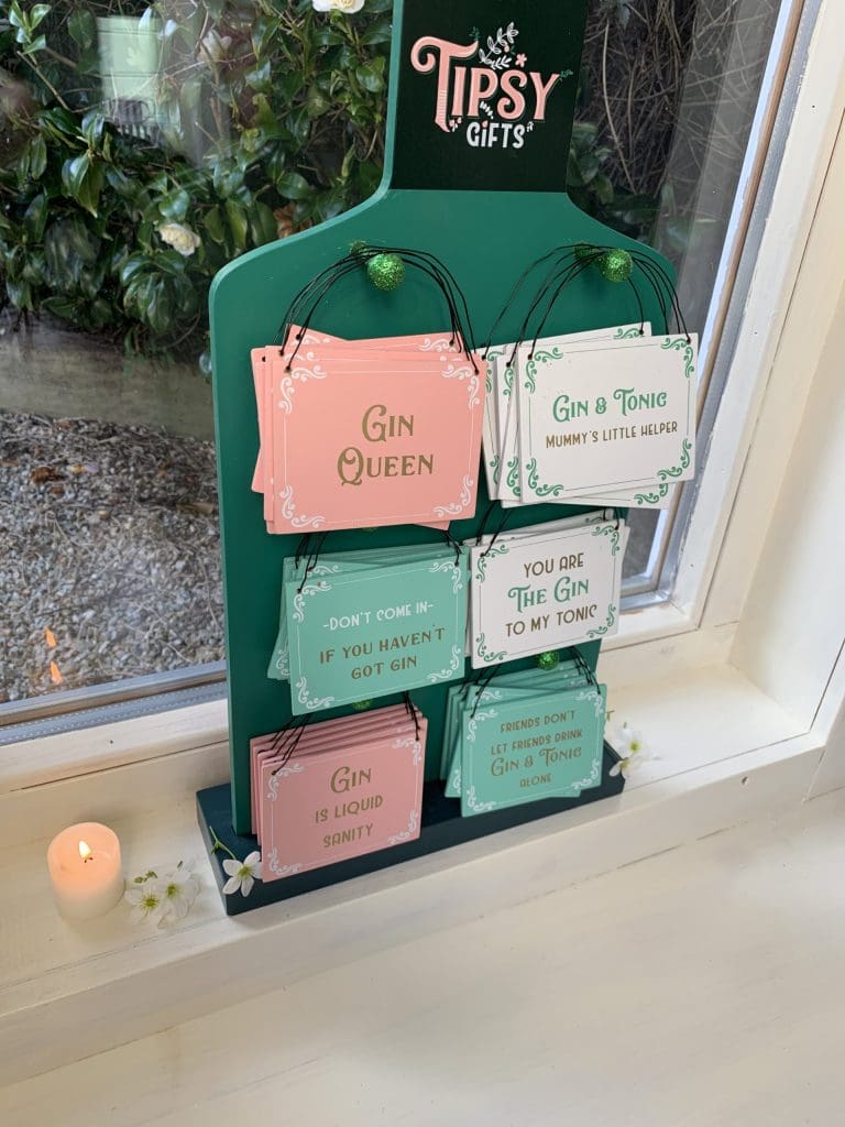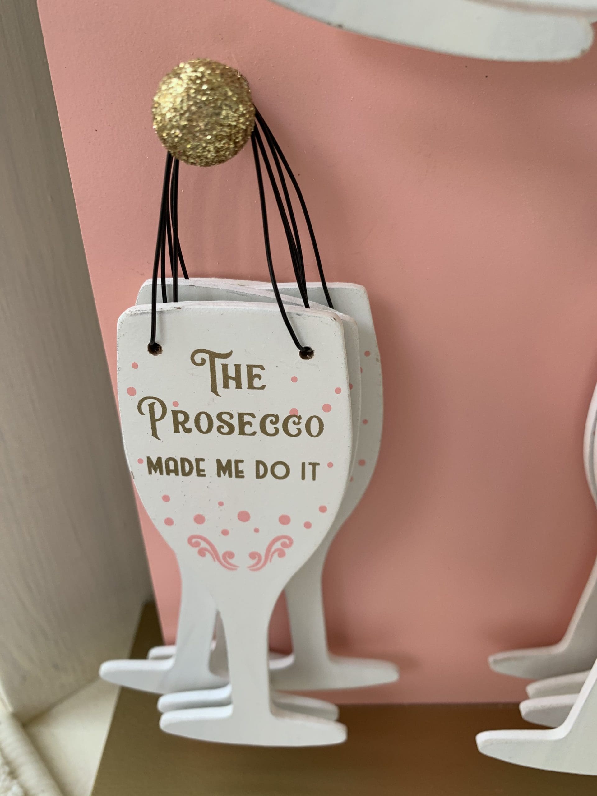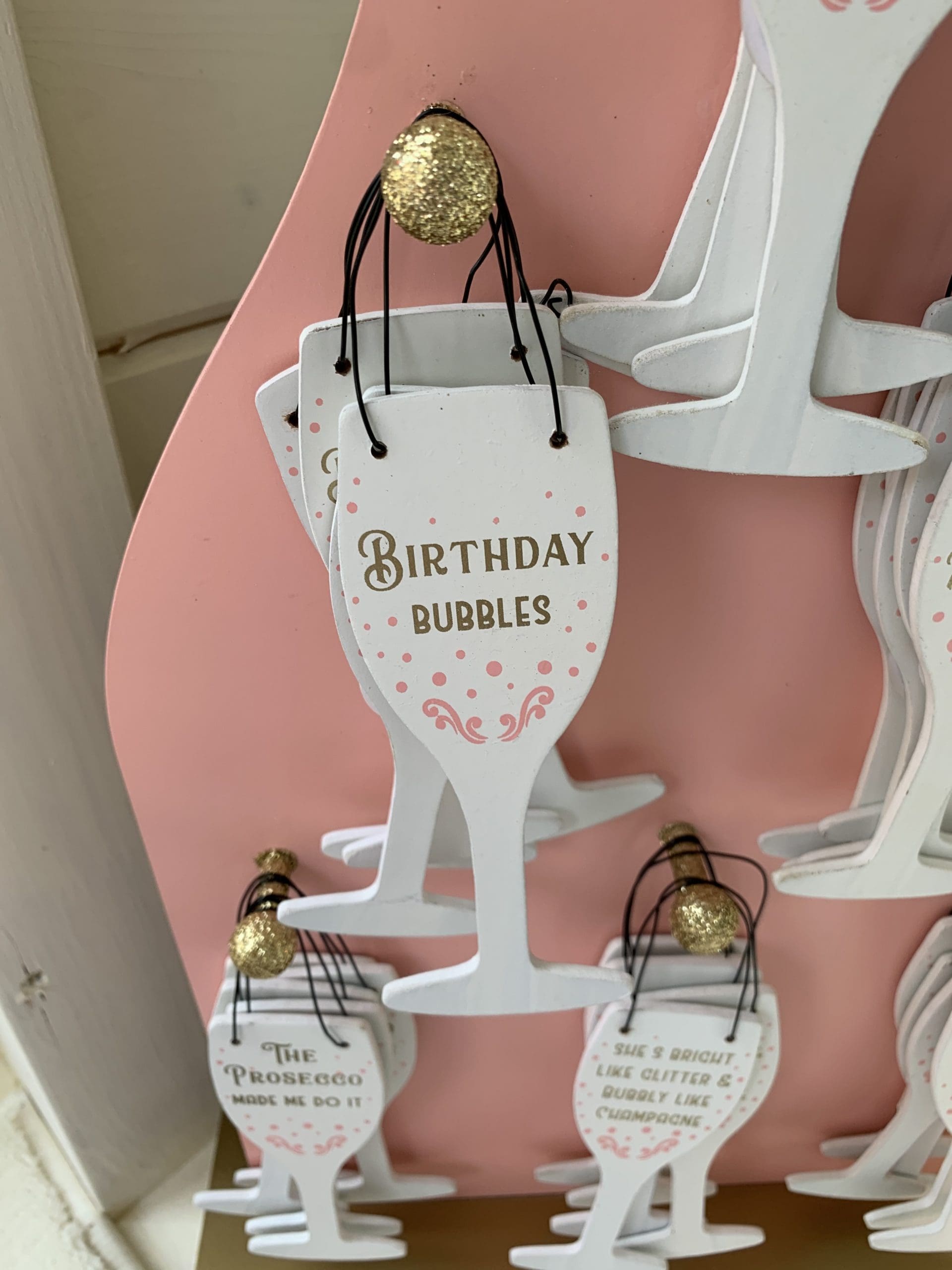 Champagne glass shaped mini hanging sign with fun sentiments about