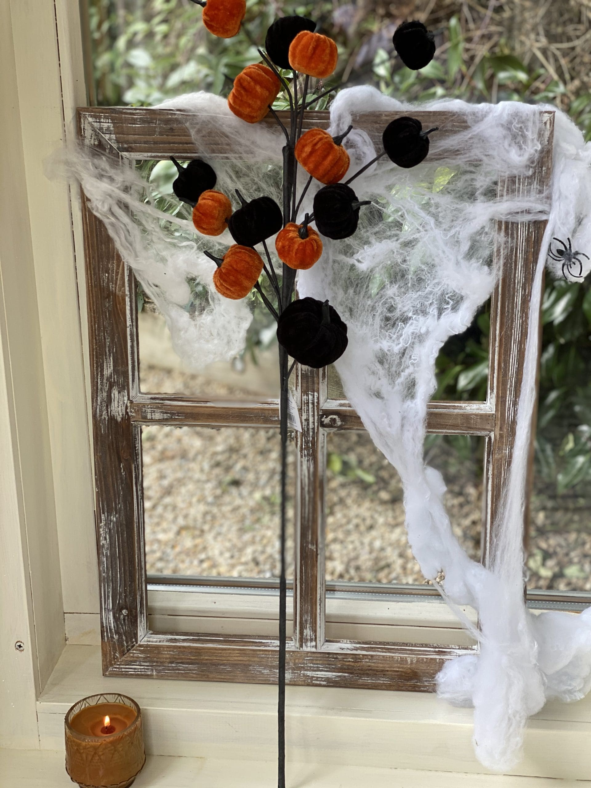 Gorgeous Velvet Black and Velvet Pumpkin decorations attached to a black branch.
